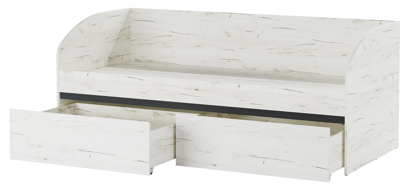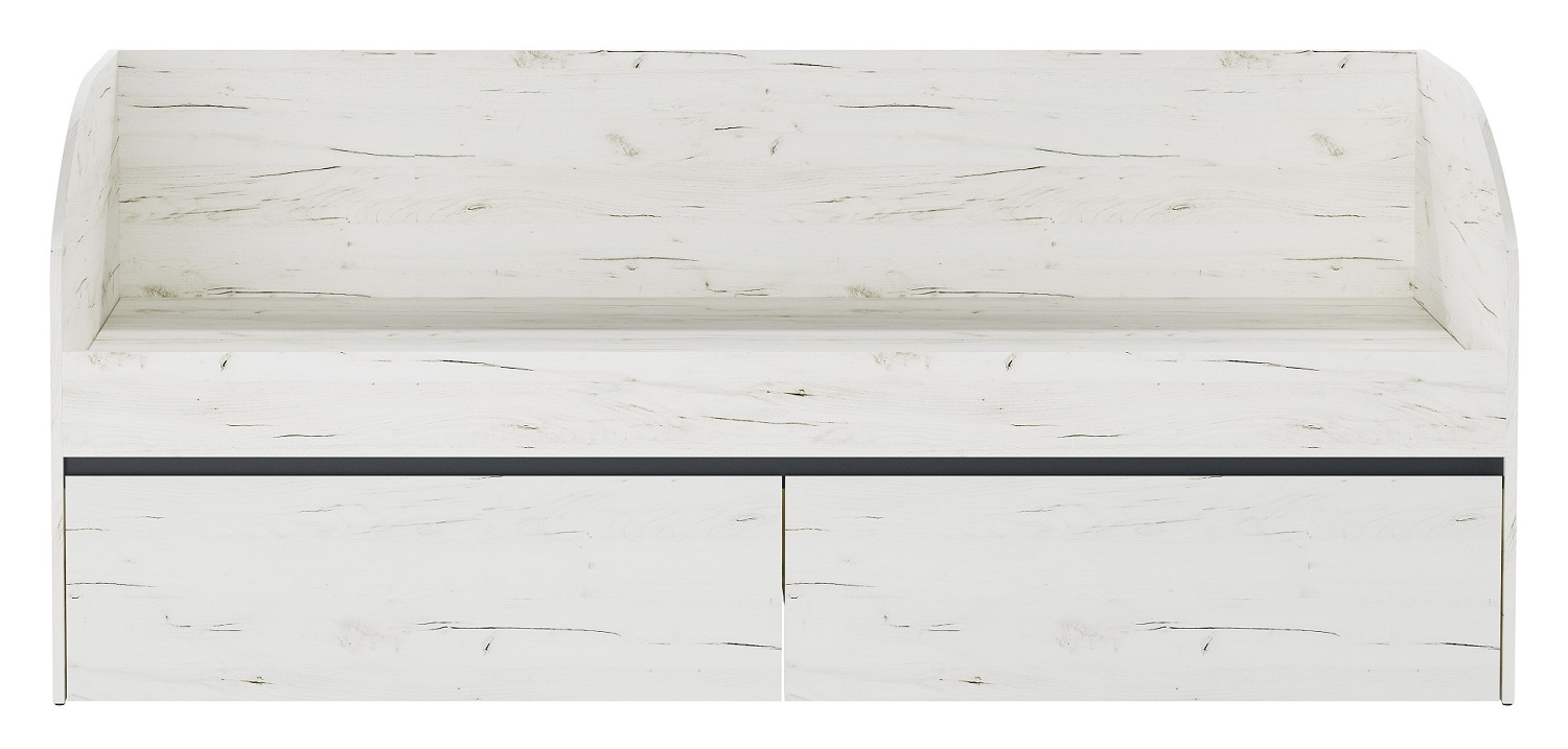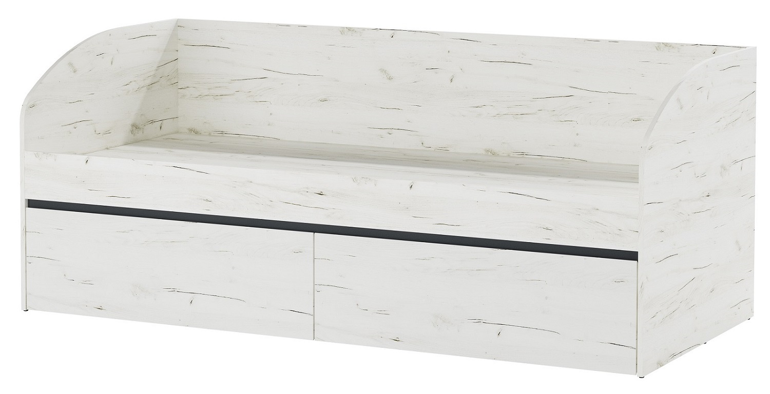 Кровать-софа «ГРЕТТА» комплектуется 2-мя вместительными выкатными ящиками на колёсиках. Кровать-софа в сочетании с другими элементами коллекции «ГРЕТТА» будет прекрасным решением для грамотной организации пространства спальни для детей и подростков, учитывая габариты спального места: 2000 х 900 мм. Применение интегрированной ручки на фасадах делает модель стильной и безопасной – ящики открываются за профилированные выступы. Фасады и боковины кровати обработаны кромкой 1 мм.