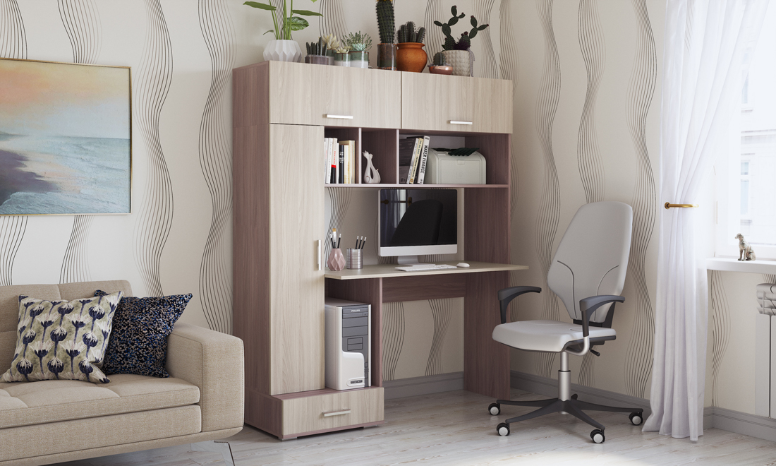 Письменно-компьютерный стол ПКС-1 с ящиком на роликовых направляющих. Для удобства открывания и удержания фасадов в открытом положении устанавливаются газлифты. Столешница обработана кромкой толщиной 1 мм, что делает работу за столом более комфортной и удобной. Чёрная матовая металлическая ручка. Рабочая зона стола 1200 х 430 х 570 мм.
