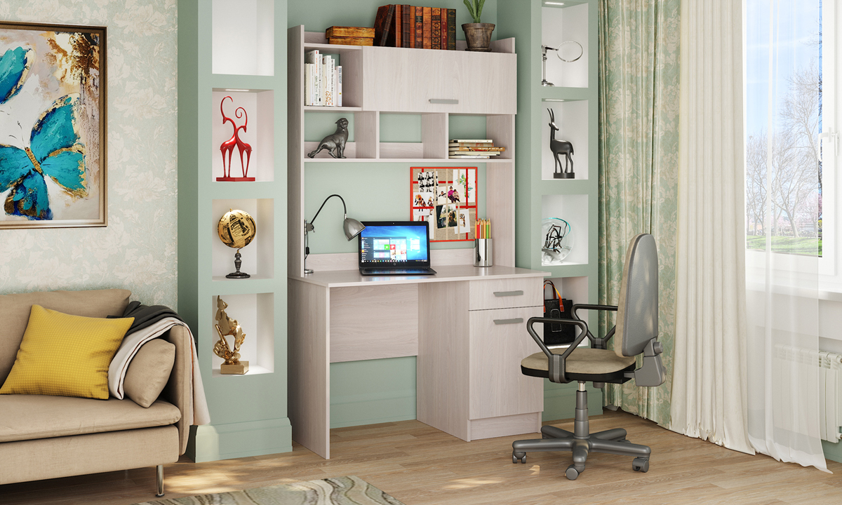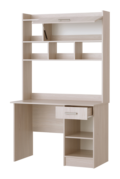 Письменно-компьютерный стол ПКС-2 с ящиком на роликовых направляющих. Для удобства открывания и удержания фасада в открытом положении устанавливается газлифт. Столешница обработана кромкой толщиной 1 мм, что делает работу за столом более комфортной и удобной. Рабочая зона стола 1086 х 510 х 554 мм.