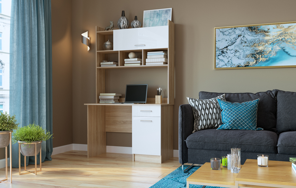 Письменно-компьютерный стол ПКС-2 с ящиком на роликовых направляющих. Для удобства открывания и удержания фасада в открытом положении устанавливается газлифт. Столешница обработана кромкой толщиной 1 мм, что делает работу за столом более комфортной и удобной. Рабочая зона стола 1086 х 510 х 554 мм.