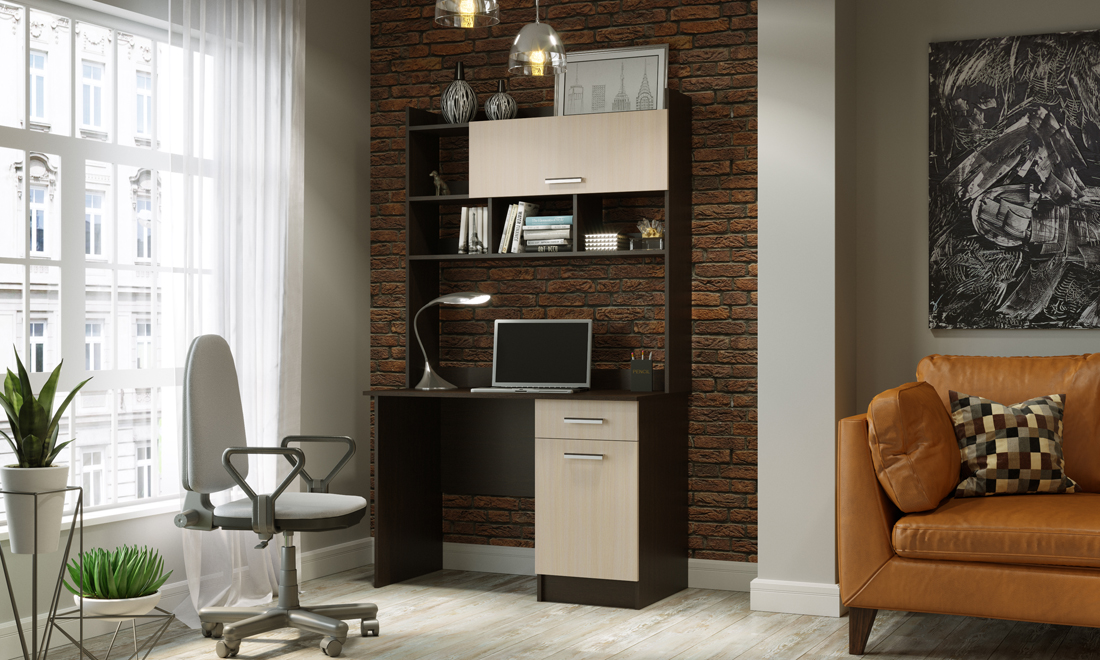Письменно-компьютерный стол ПКС-2 с ящиком на роликовых направляющих. Для удобства открывания и удержания фасада в открытом положении устанавливается газлифт. Столешница обработана кромкой толщиной 1 мм, что делает работу за столом более комфортной и удобной. Рабочая зона стола 1086 х 510 х 554 мм.
