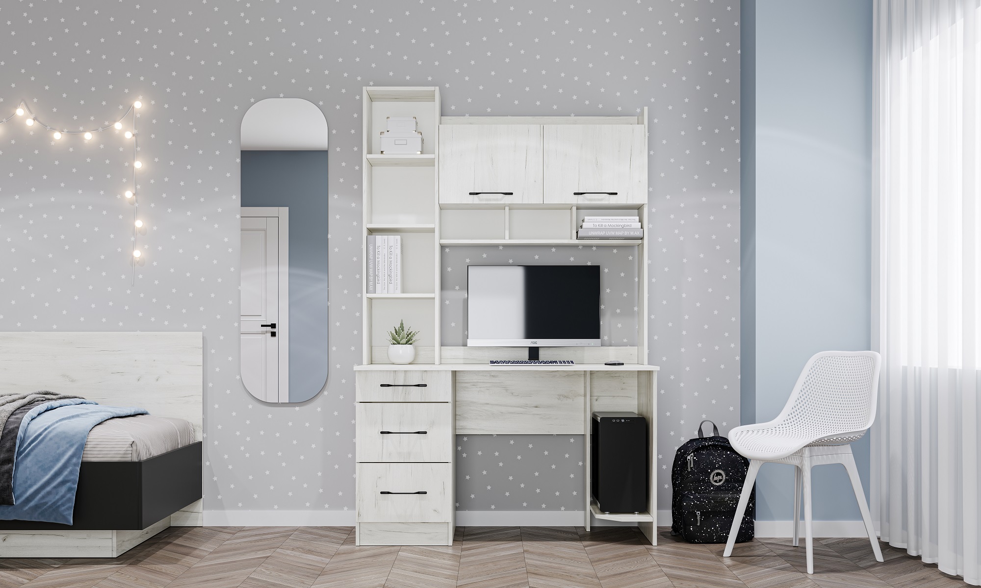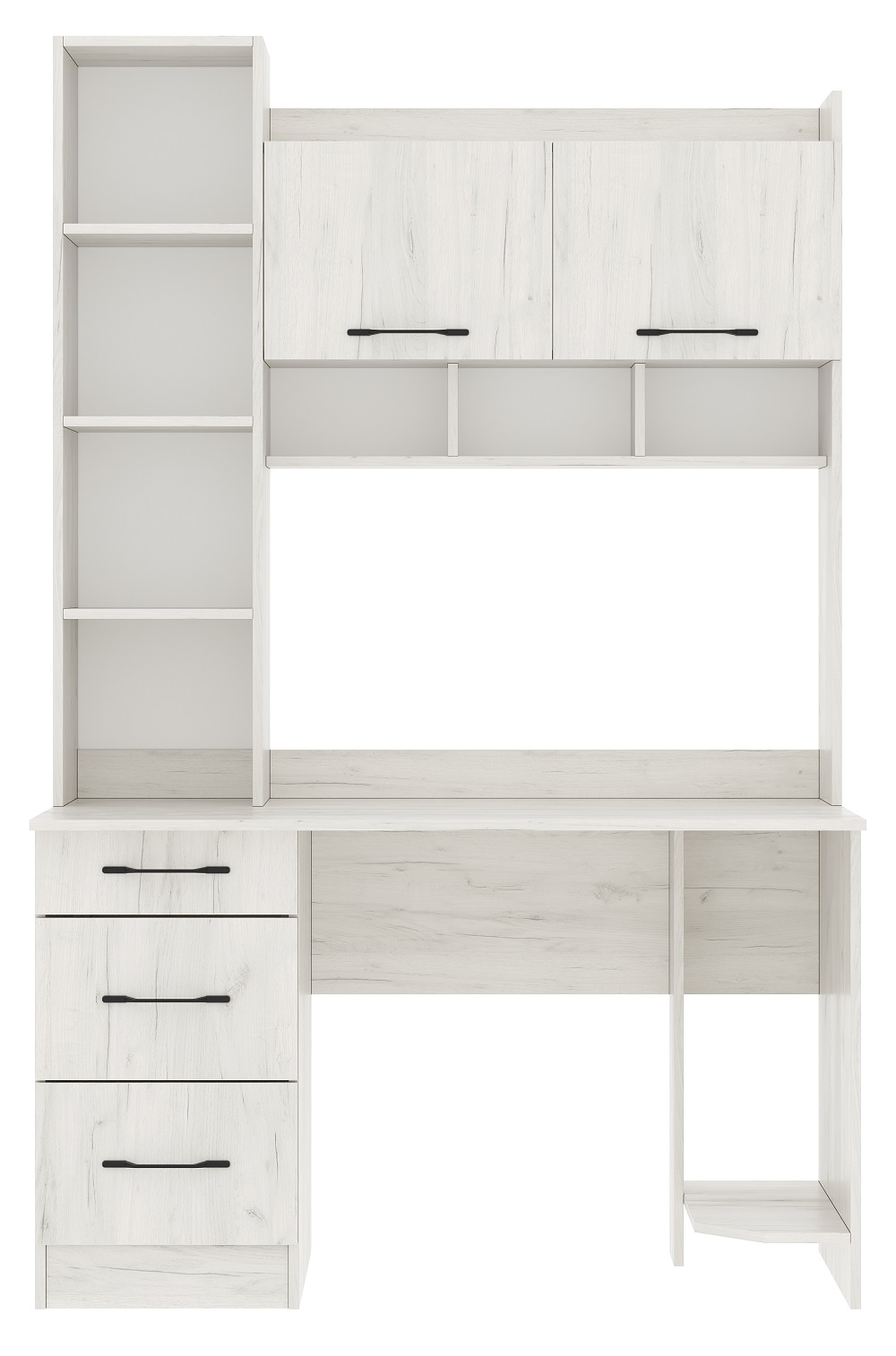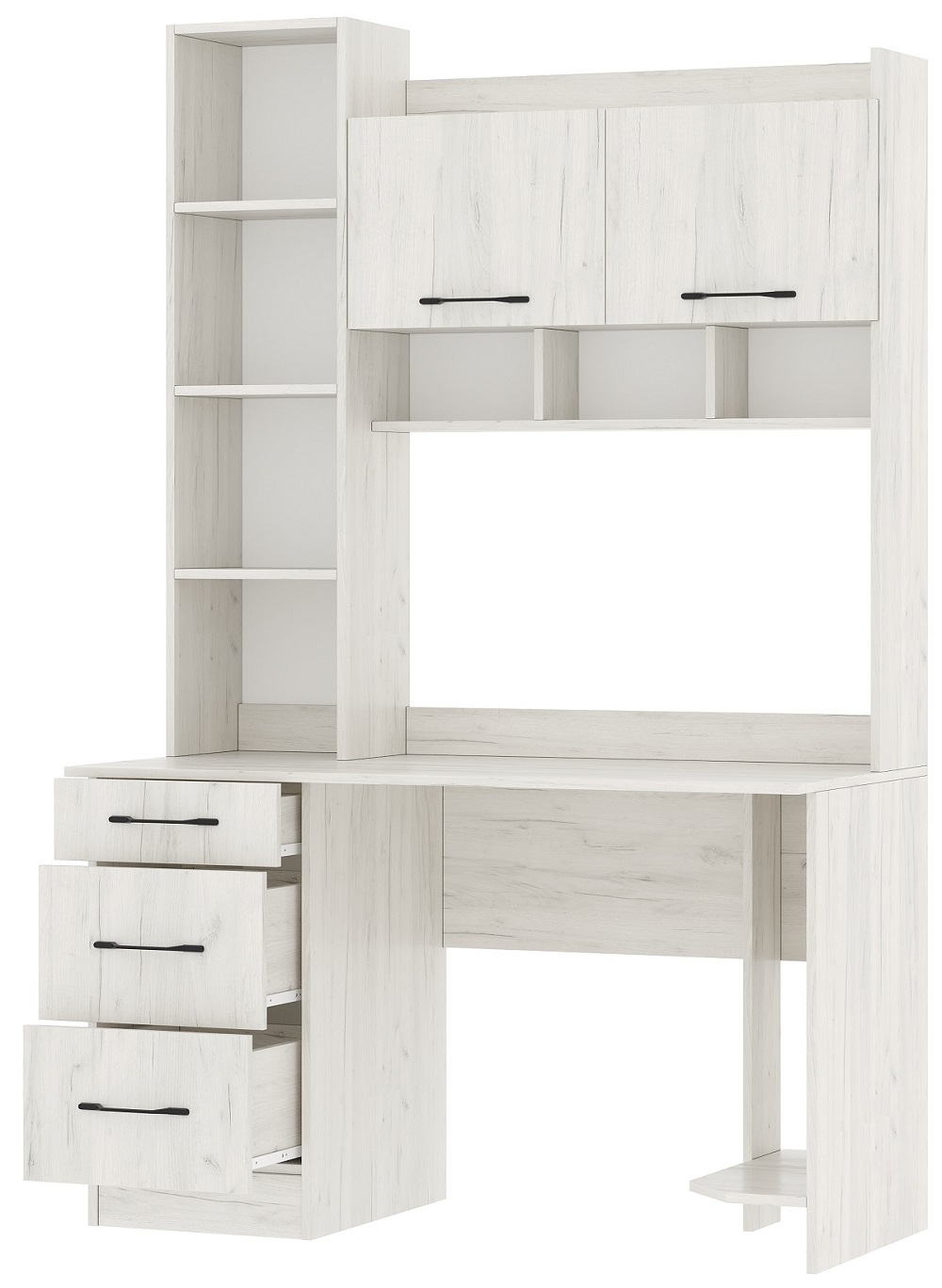 Письменно-компьютерный стол ПКС-5 с 3-мя ящиками на роликовых направляющих и нишей для системного блока. Для удобства открывания и удержания фасадов в открытом положении устанавливаются газлифты. Столешница обработана кромкой толщиной 1 мм, что делает работу за столом более комфортной и удобной. Чёрная матовая металлическая ручка. Рабочая зона стола 902 х 540 х 584 мм.