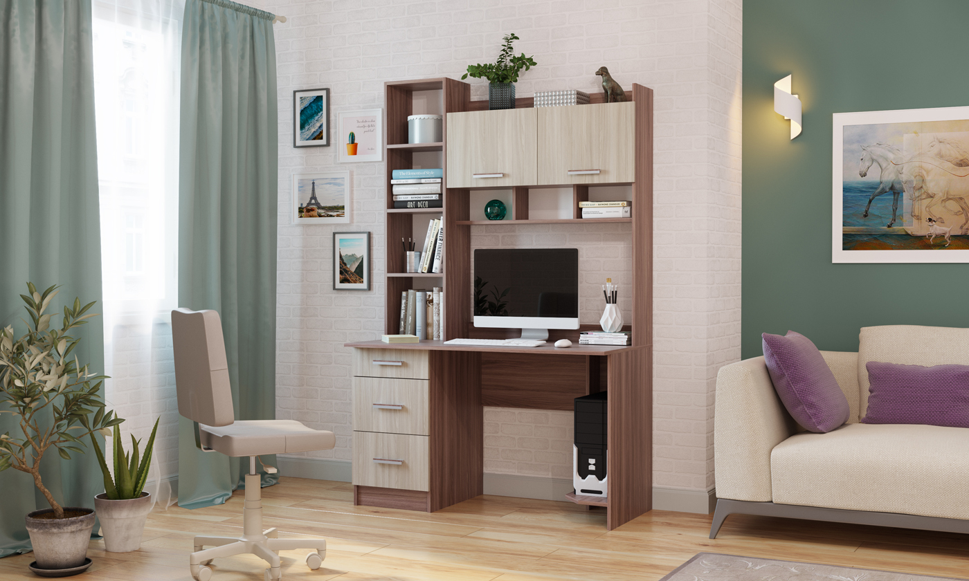 Письменно-компьютерный стол ПКС-5 с 3-мя ящиками на роликовых направляющих и нишей для системного блока. Для удобства открывания и удержания фасадов в открытом положении устанавливаются газлифты. Столешница обработана кромкой толщиной 1 мм, что делает работу за столом более комфортной и удобной. Рабочая зона стола 902 х 540 х 584 мм.