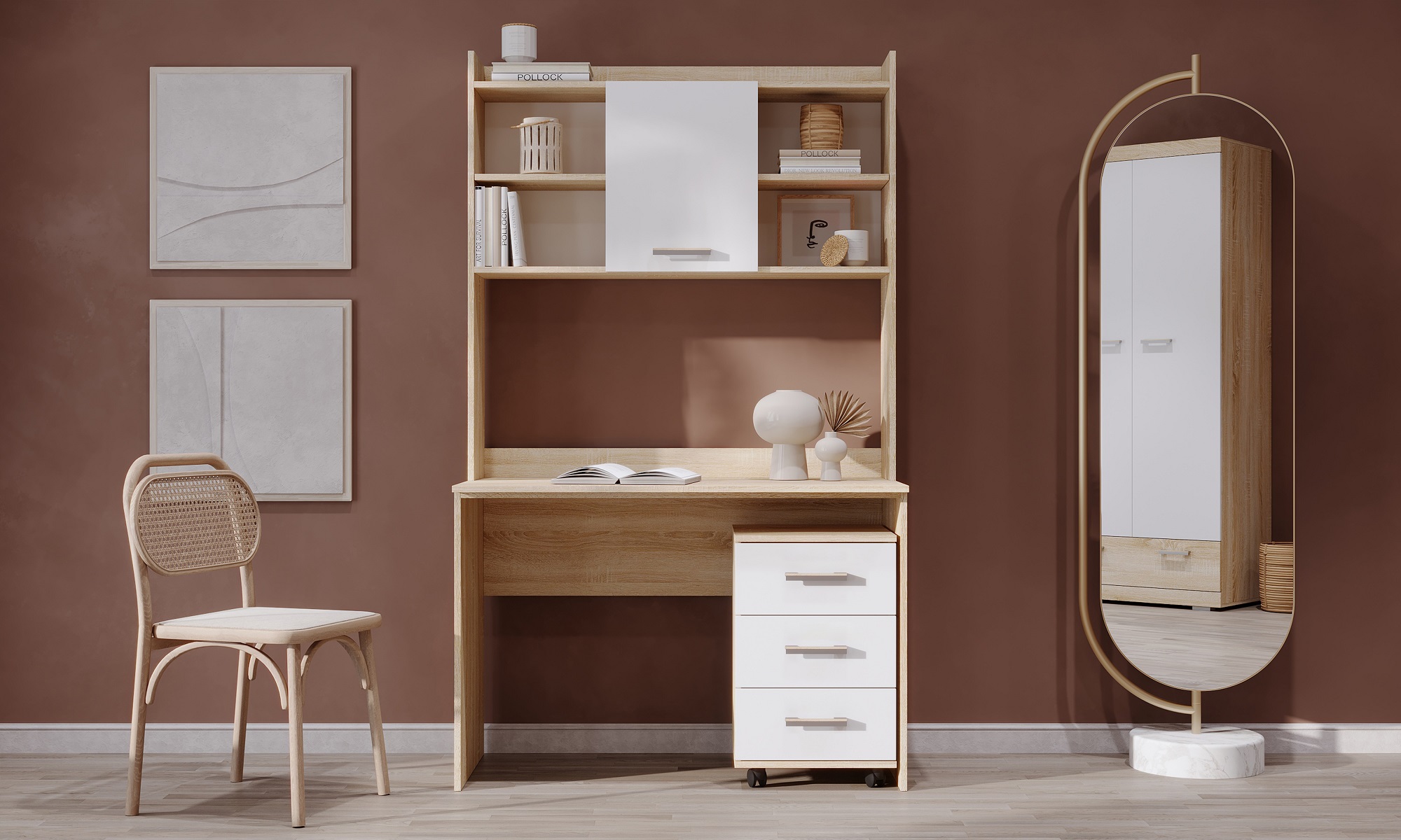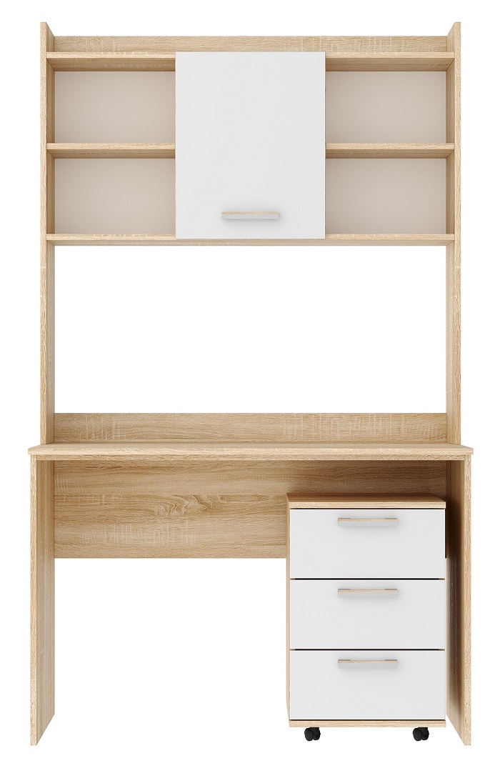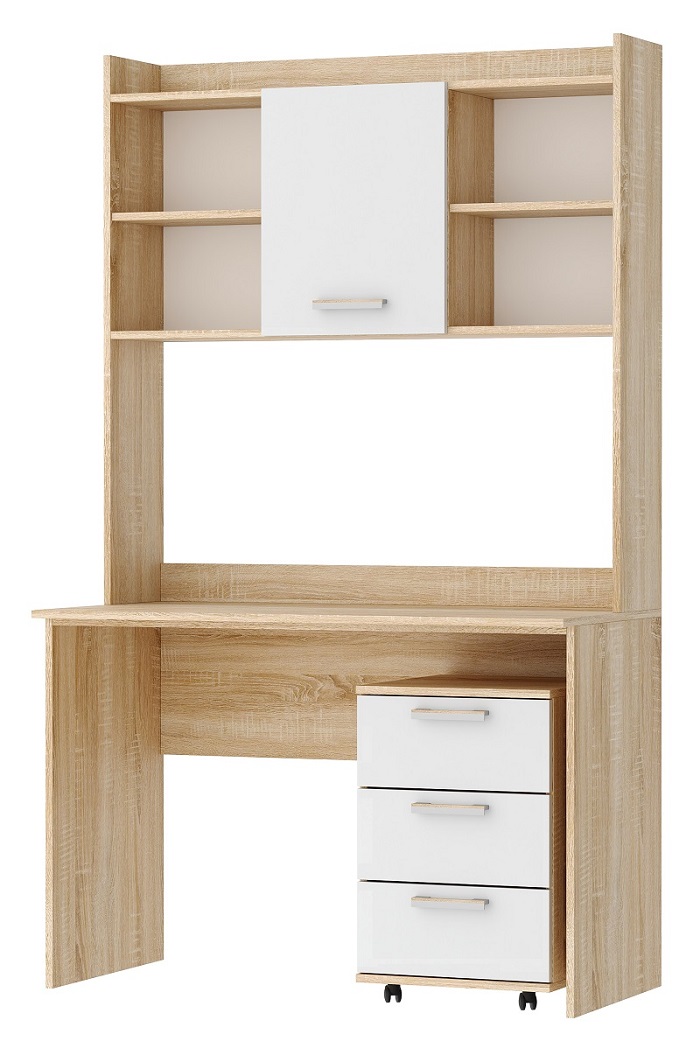 Письменно-компьютерный стол ПКС-9 с надстройкой, с выкатной тумбой с 3-мя ящиками на направляющих полного выдвижения. Для удобства открывания и удержания фасада в открытом положении устанавливается газлифт. Столешница обработана кромкой 1 мм, что делает работу за столом более комфортной и удобной. Чёрная матовая металлическая ручка. Рабочая зона стола 1118 х 545 х 554 мм.