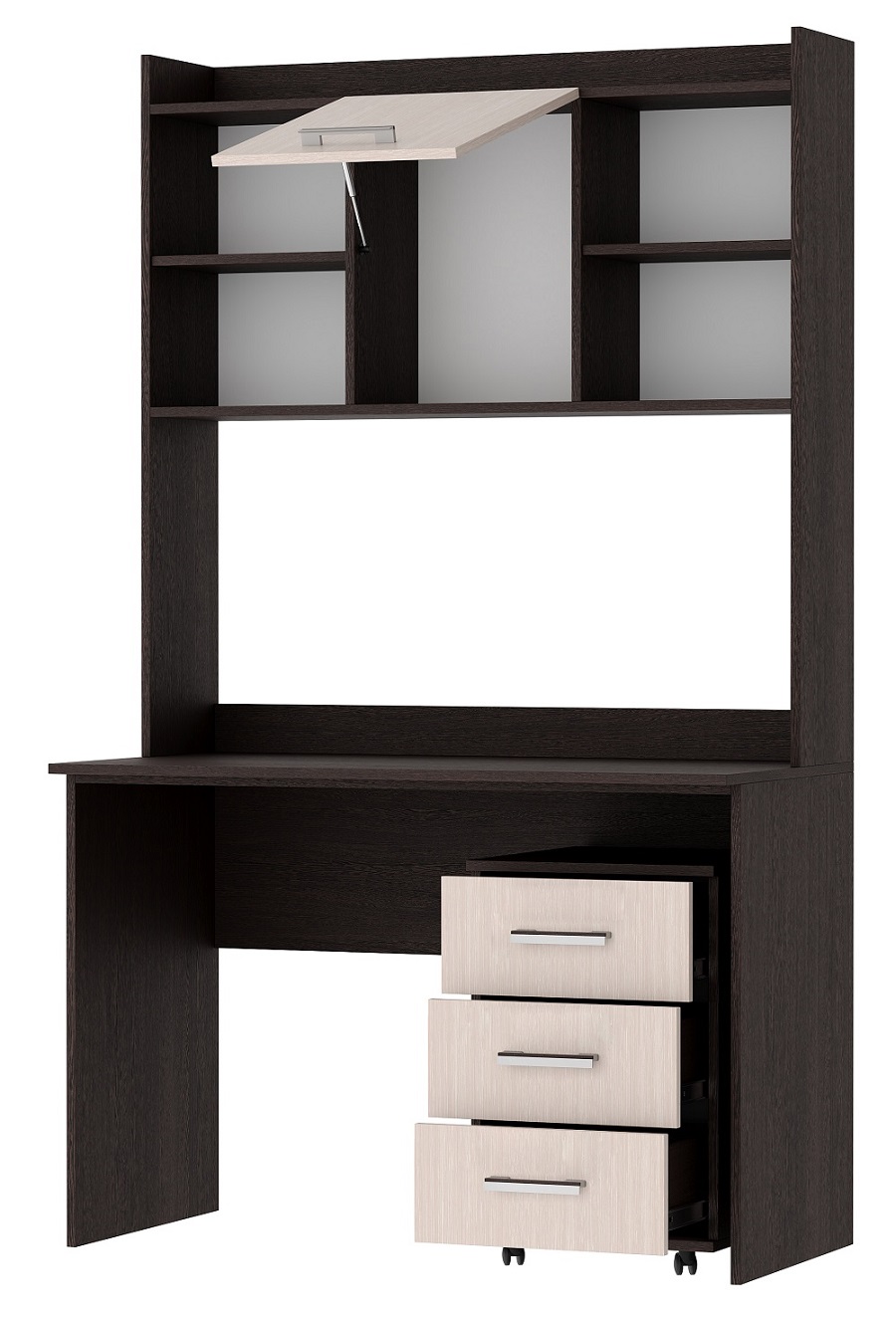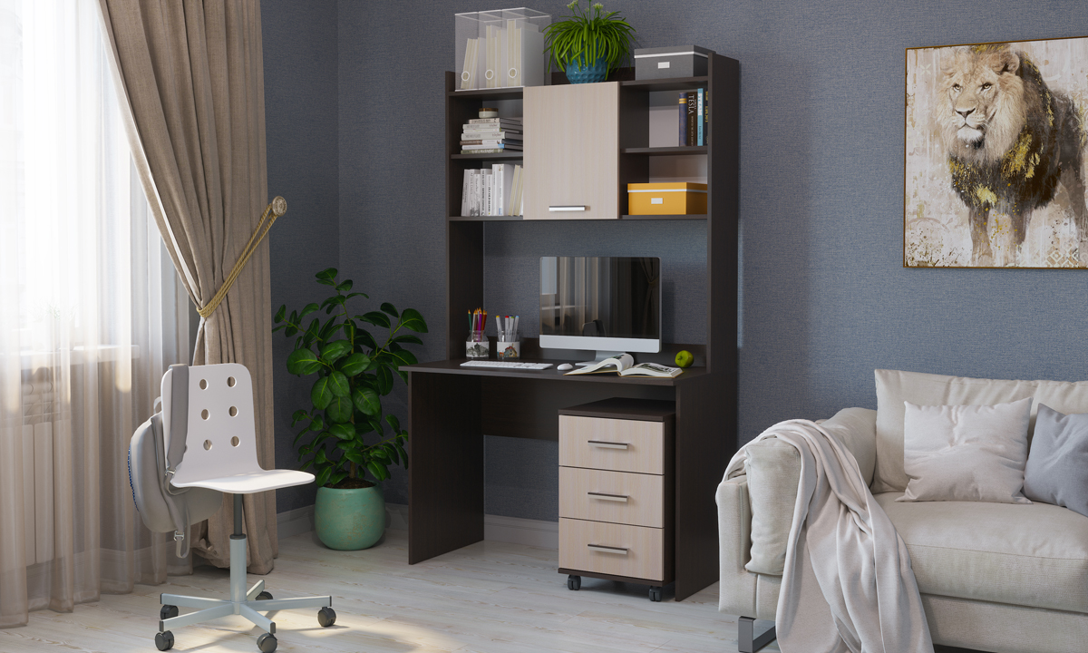 Письменно-компьютерный стол ПКС-9 с надстройкой, с выкатной тумбой с 3-мя ящиками на направляющих полного выдвижения. Для удобства открывания и удержания фасада в открытом положении устанавливается газлифт. Столешница обработана кромкой 1 мм, что делает работу за столом более комфортной и удобной. Чёрная матовая металлическая ручка. Рабочая зона стола 1118 х 545 х 554 мм.