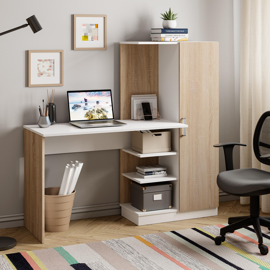 конструкция модели представляет собой вместительную столешницу, зону с открытыми полками,