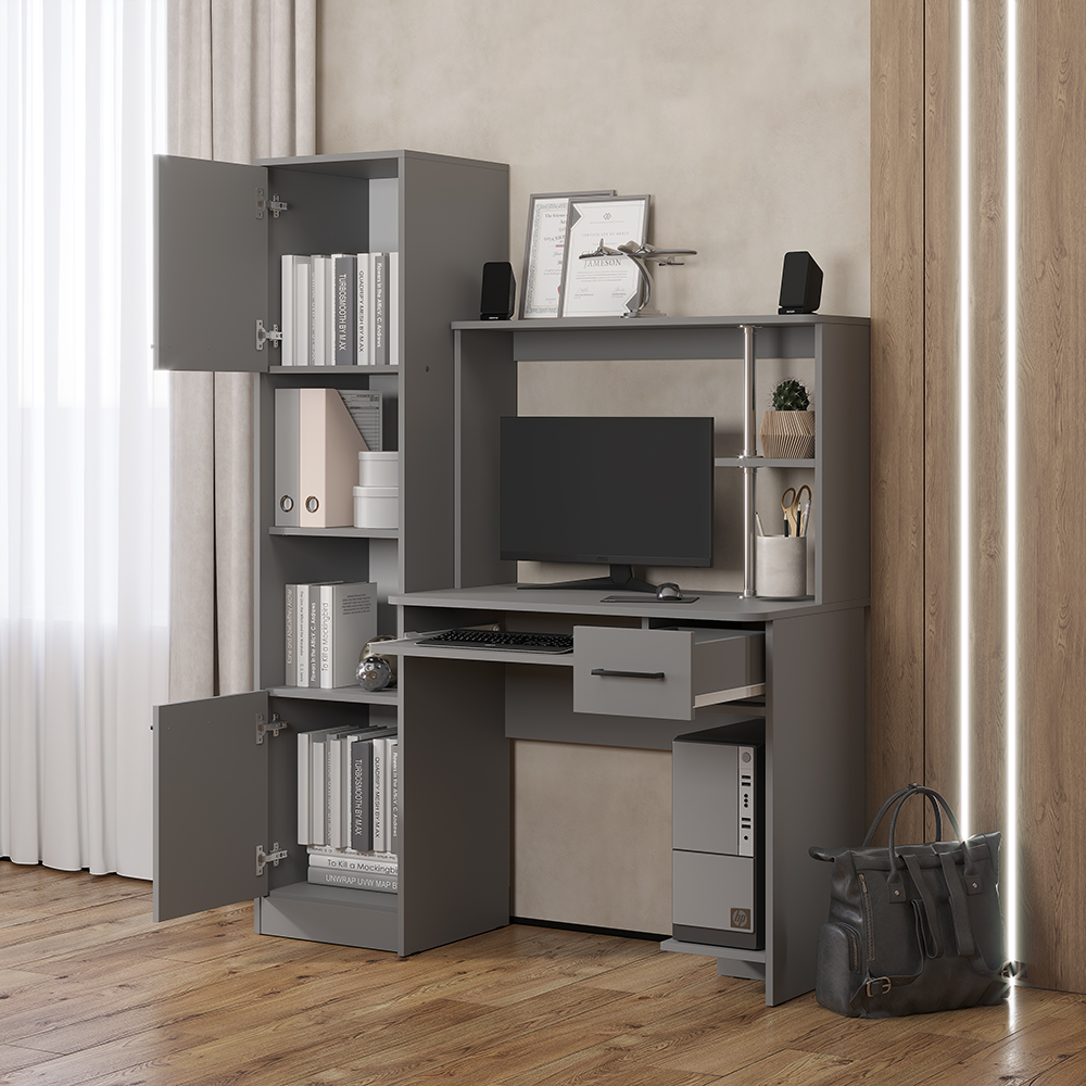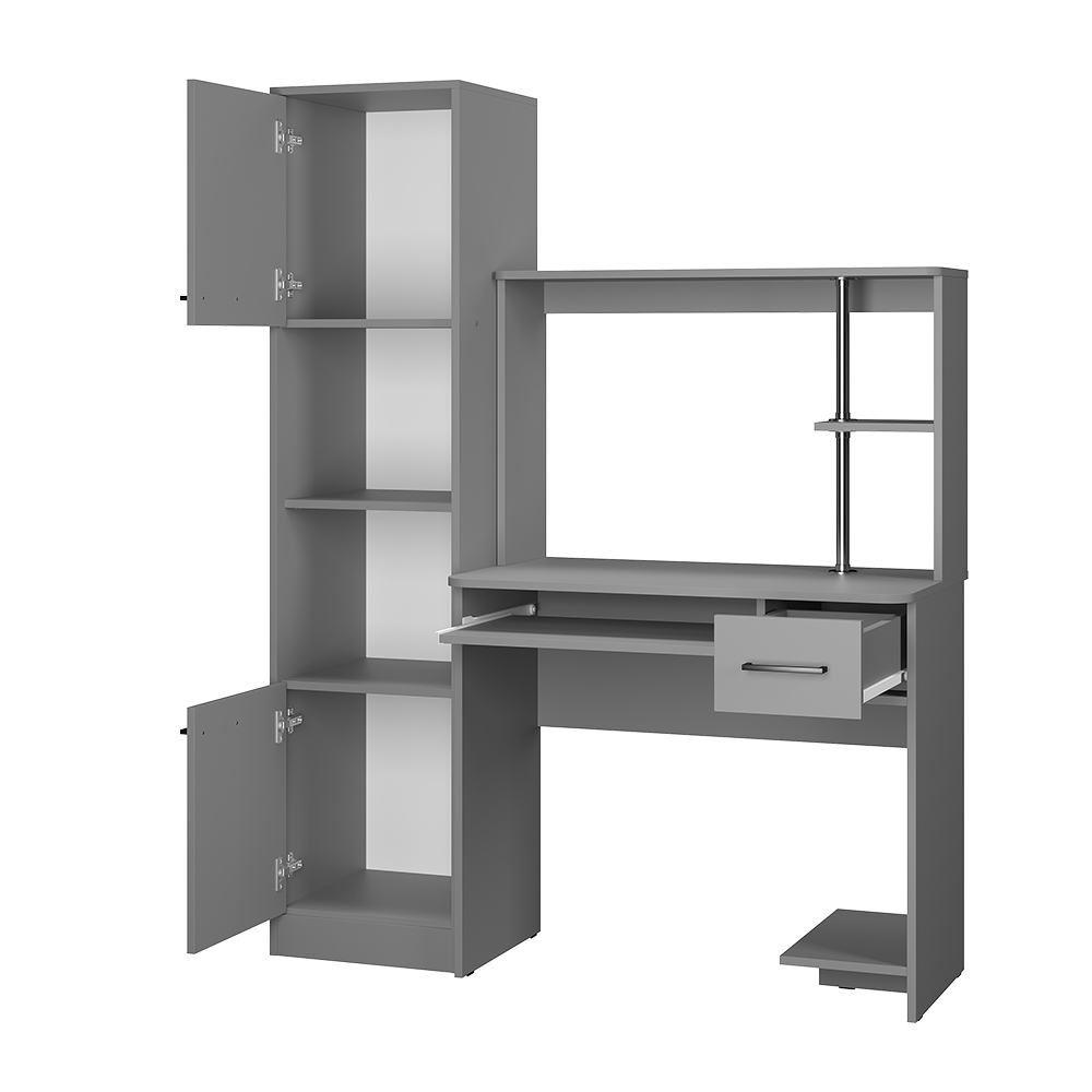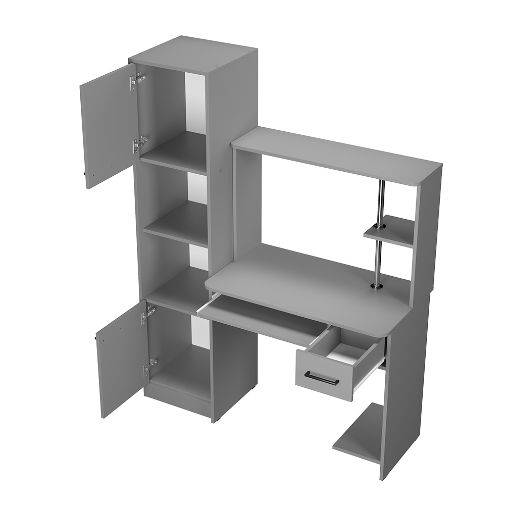 Модель компьютерного стола «Дебют» имеет все необходимые элементы для размещения стационарного компьютера: вместительную столешницу, отделение для процессора и выкатывающуюся полку для клавиатуры. Дополнительно стол оснащен пеналом с дверцей, несколькими открытыми зонами и выдвижным ящиком для хранения необходимых в работе вещей.