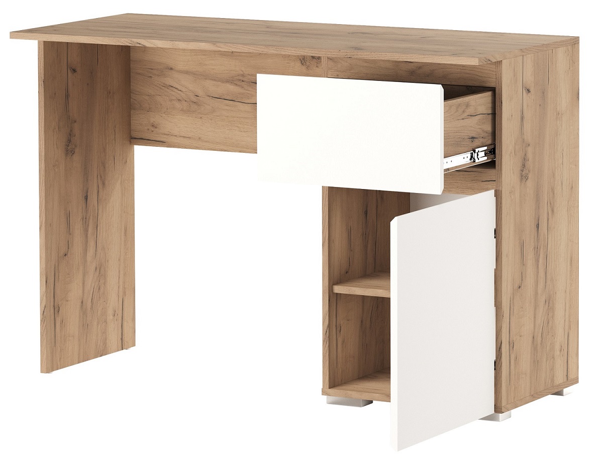 Стол письменно-компьютерный 1С1Я «ГРЕТТА» с ящиком на направляющих полного выдвижения. Крышка стола и фасады обработаны кромкой толщиной 1 мм, что делает работу за столом более комфортной и удобной. Применение интегрированной ручки на фасадах делает модель стильной и безопасной – дверцы открываются за профилированные выступы. Чёрная регулируемая ножка-опора.