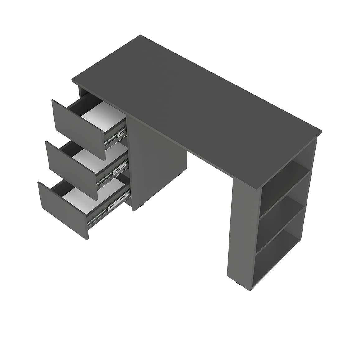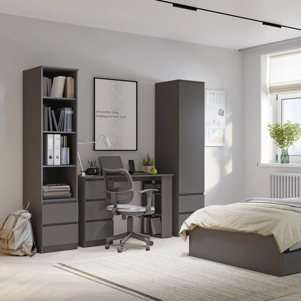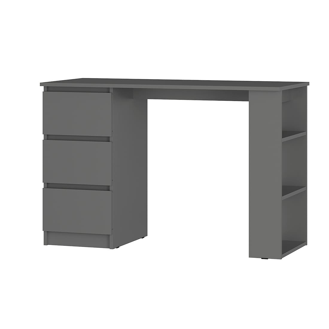 Стол письменный «Симпл» (ПС-07) — компактный, но просторный стол отлично подойдет для работы и учебы. На большой столешнице очень удобно рисовать или делать домашние задания. Здесь найдётся место как для ноутбука, так и для монитора с клавиатурой. Тумба с тремя выдвижными ящиками на шариковых направляющих для школьных принадлежностей и три открытых полки собираются зеркально. Максимальная нагрузка на ящик - 5 кг, на вязку - 10 кг. «Симпл» - это современная коллекция функциональной мебели. В ней собраны все необходимые предметы для интерьера спальни, гостиной и личной комнаты: шкафы, кровати, комоды, столы, тумбы. Также в состав композиции входят малые формы, которые станут изюминкой вашего дома. Коллекция полностью соответствует своему названию. Простой и стильный дизайн, отсутствие лицевой фурнитуры, распашные створки на отталкивателях (кроме тумбы ТБ-06 и тумбы ТБ-19) покорит ценителей минимализма. Мебель, выполненная в спокойных оттенках «белый» и «графит», идеально дополнит как классический, так и современный интерьер. Коллекция отличается практичностью и функциональностью. Полноценный набор мебели позволяет экспериментировать с пространством. Ещё одна особенность коллекции заключается в уникальной фрезеровке торцов фасадов - она выполнена под углом 45 градусов. Благодаря этой детали образовывается удобная интегрированная ручка, которая делает использование мебели более комфортным. Мебель этой коллекции оснащена надежными опорами из безопасного пластика – это позволит не только комфортно проводить влажную уборку, но и уберечь напольное покрытие от повреждений.
