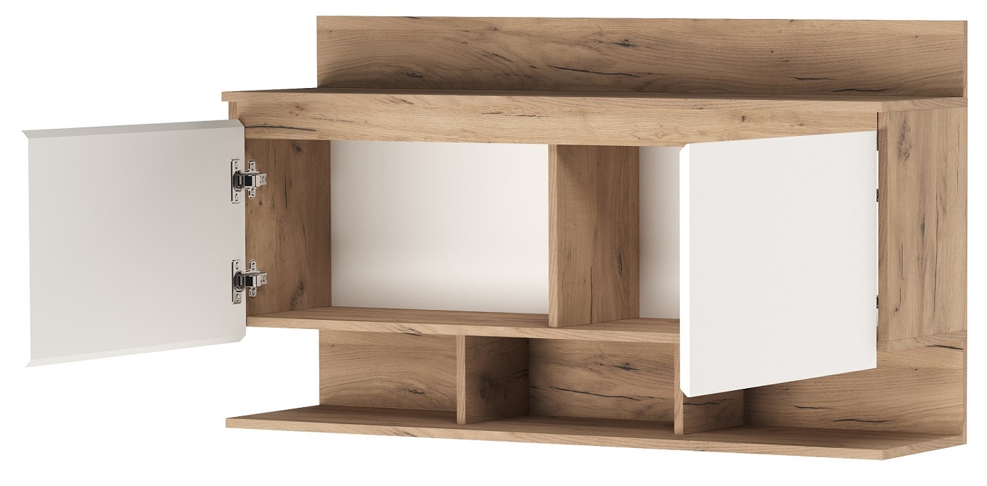 Антресоль 1200 «ГРЕТТА» 2-створчатая с полкой. Крепится к стене через навесные элементы. Для удобства открывания и удержания фасада в открытом положении устанавливаются газлифты. Применение интегрированной ручки на фасадах делает модель стильной и безопасной – дверцы открываются за профилированные выступы. Фасады обработаны кромкой 1 мм.