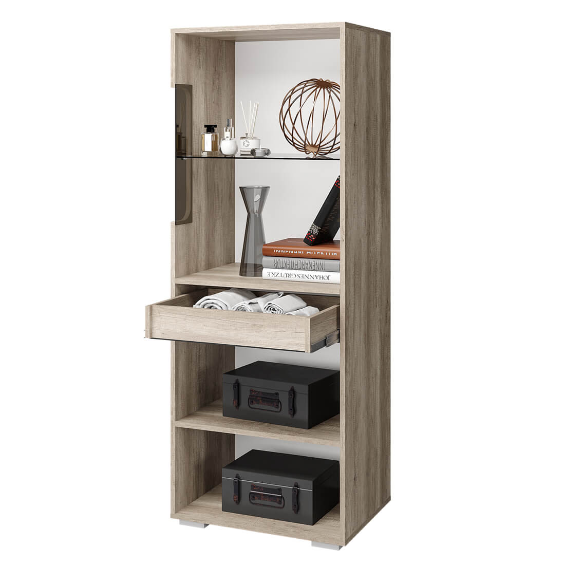 Максимальная нагрузка на стеклянную полку - 3 кг, на ящик - 5 кг, на полку ЛДСП - 10 кг.