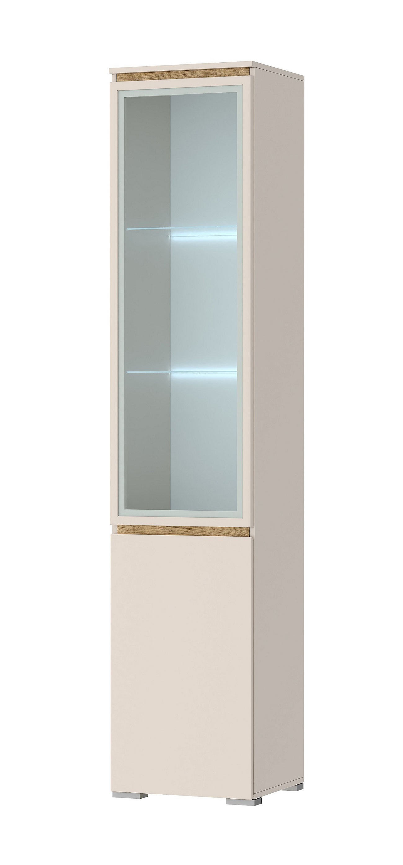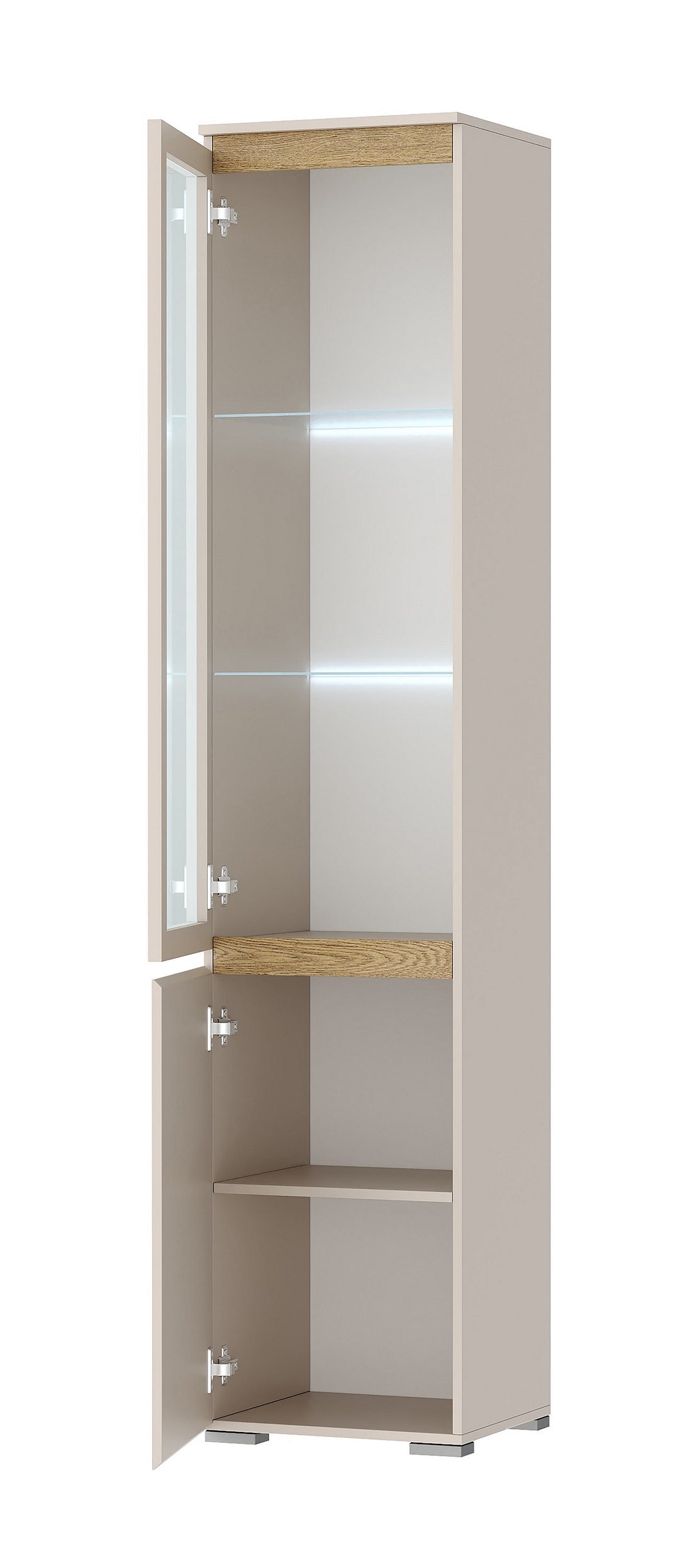 Пенал-витрина 1В1С «ГРЕТТА» 2-створчатый со стеклополками. Применение интегрированной ручки на фасадах делает модель стильной и безопасной – дверцы открываются за профилированные выступы. Фасады обработаны кромкой 1 мм. Возможна установка светодиодной подсветки стеклополок (дополнительная опция). Серебристая регулируемая ножка-опора.