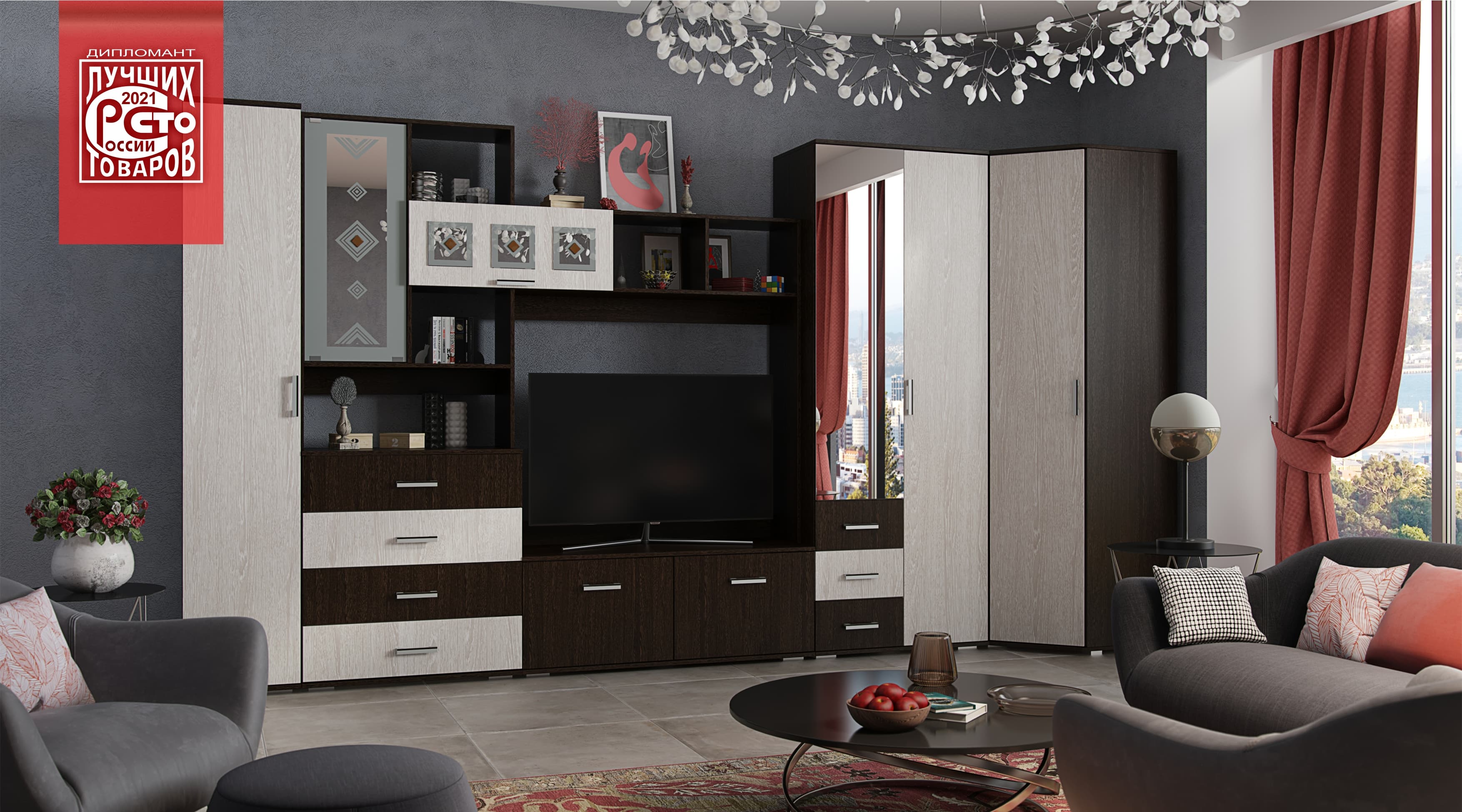 Композиция №1 состоит из центральной секции с тумбой под ТВ диагональю до 40 дюймов, пенала, двухстворчатого шкафа и вместительного углового шкафа.
