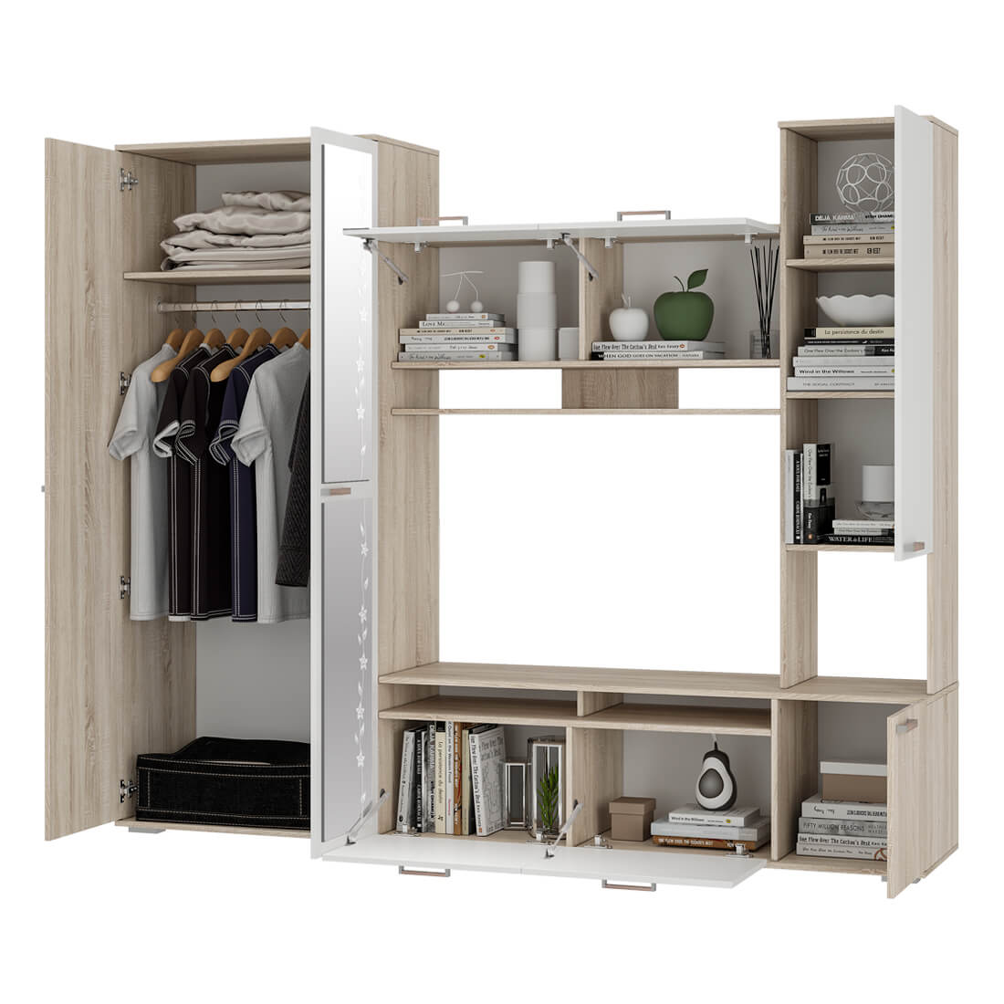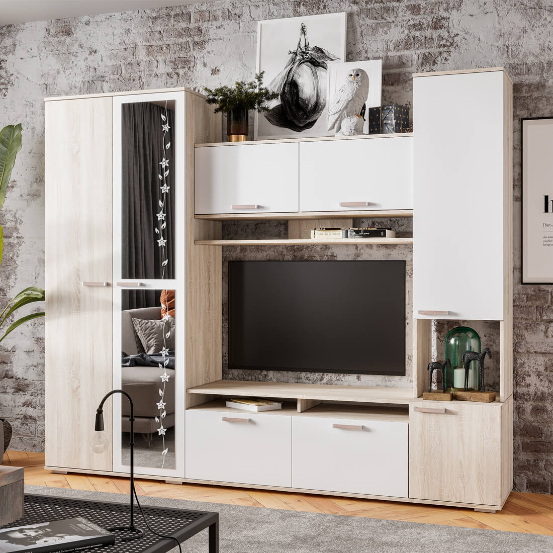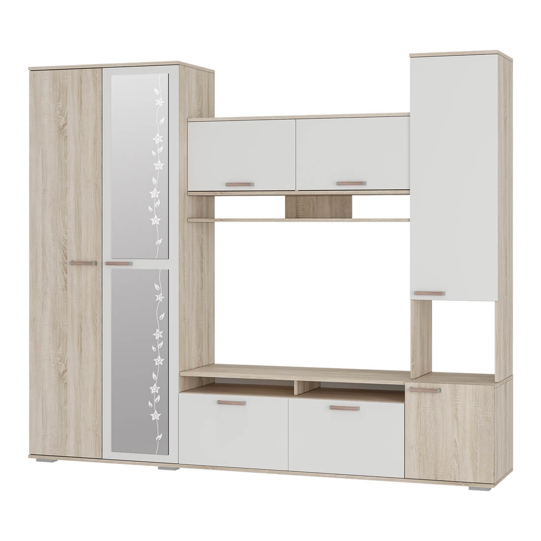 Компактный гарнитур «Лукас» – это функциональная стилизованная модель с простыми геометрическими формами и множеством полезного пространства. Контрастное сочетание фасадов белого цвета с древесной фактурой дуб сонома, а также отделка зеркалами станут ярким акцентом любого интерьера.