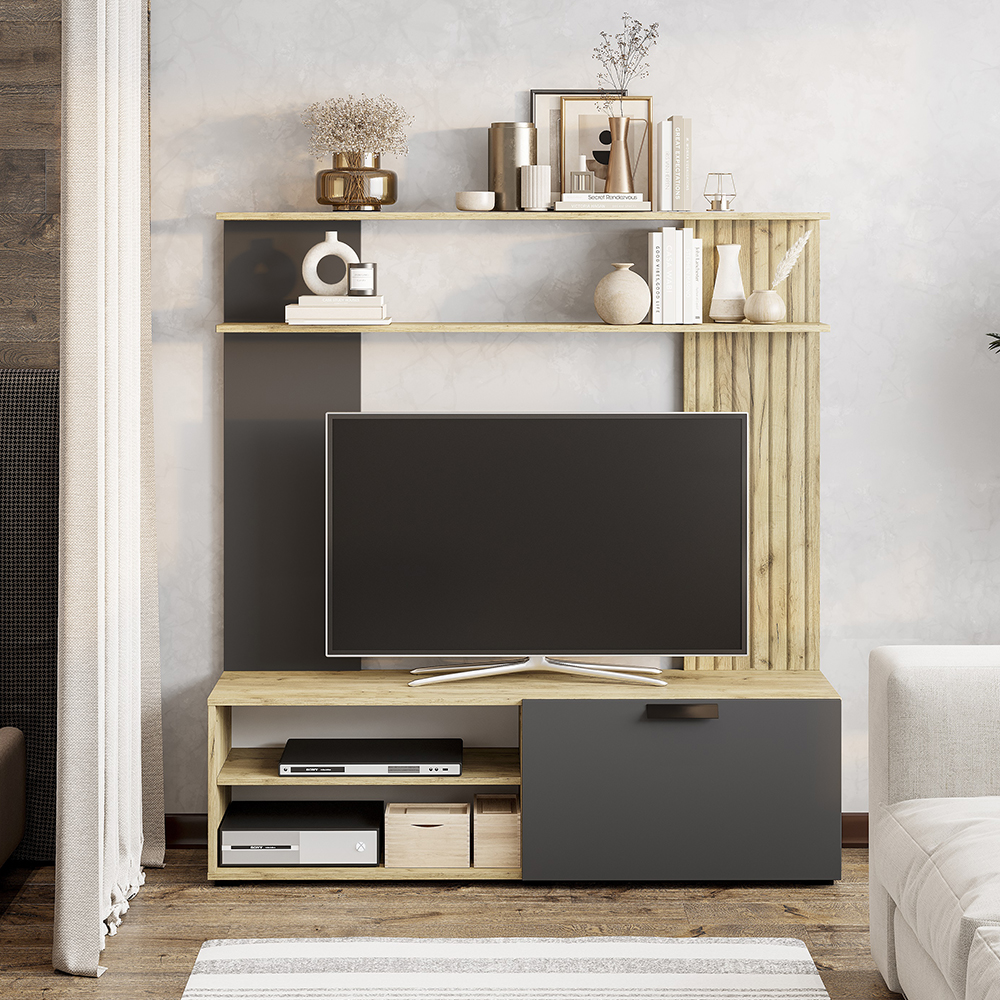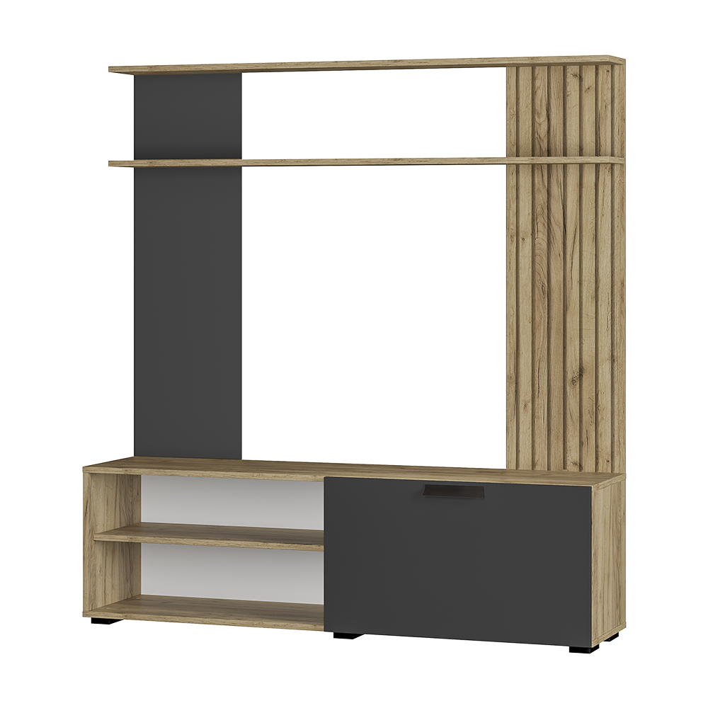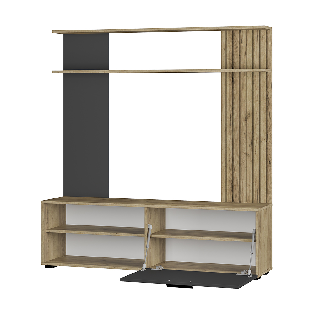 Гостиная «Мишель» - это модель с универсальной конструкцией для современного дома. Фасады в глубоком оттенке «графит» будут отлично контрастировать со стенами в нейтральных или насыщенных холодных тонах. Корпус и поверхности, выполненные в цвете «крафт», хорошо гармонируют с фотопечатью, имитирующей деревянные рейки.