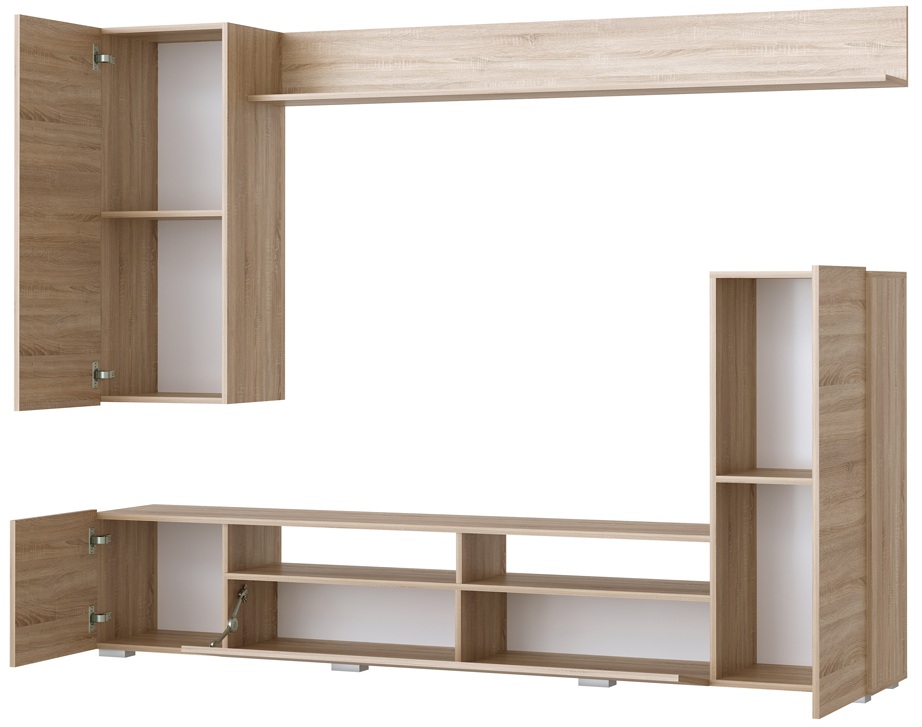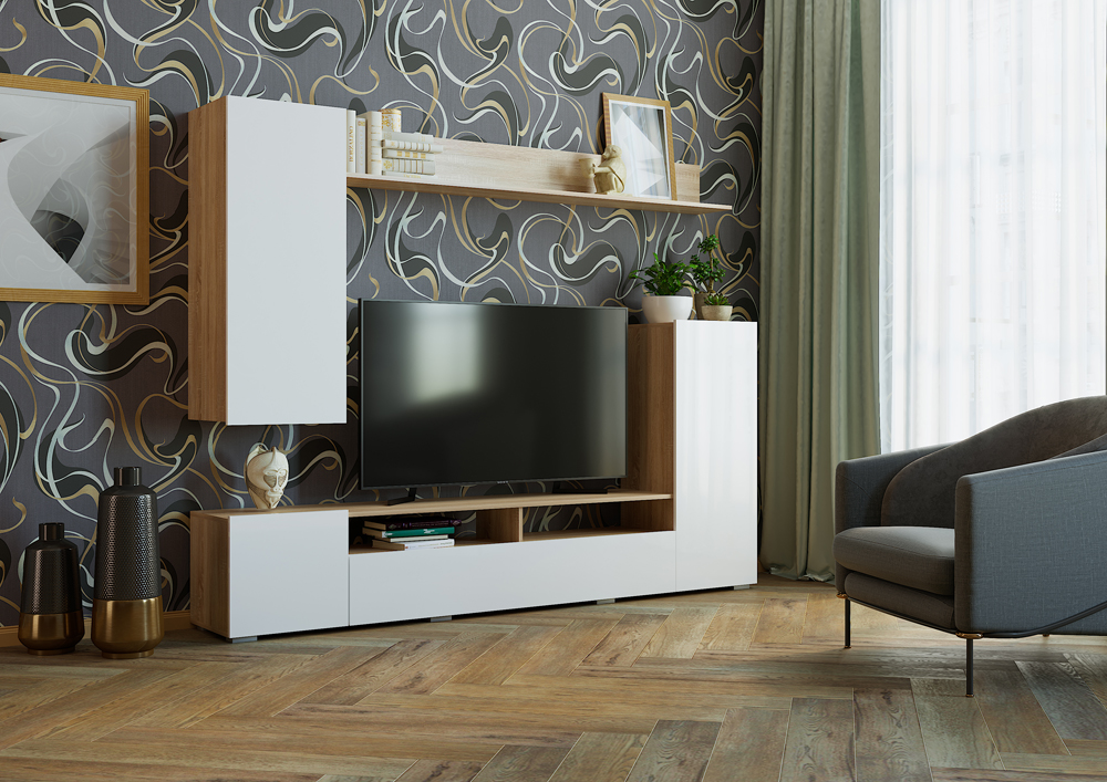 Гостиная «Мия» состоит из 2-х секций. Напольная тумба с пеналом и навесная антресоль с полкой. Антресоль крепится к стене через навесные элементы.