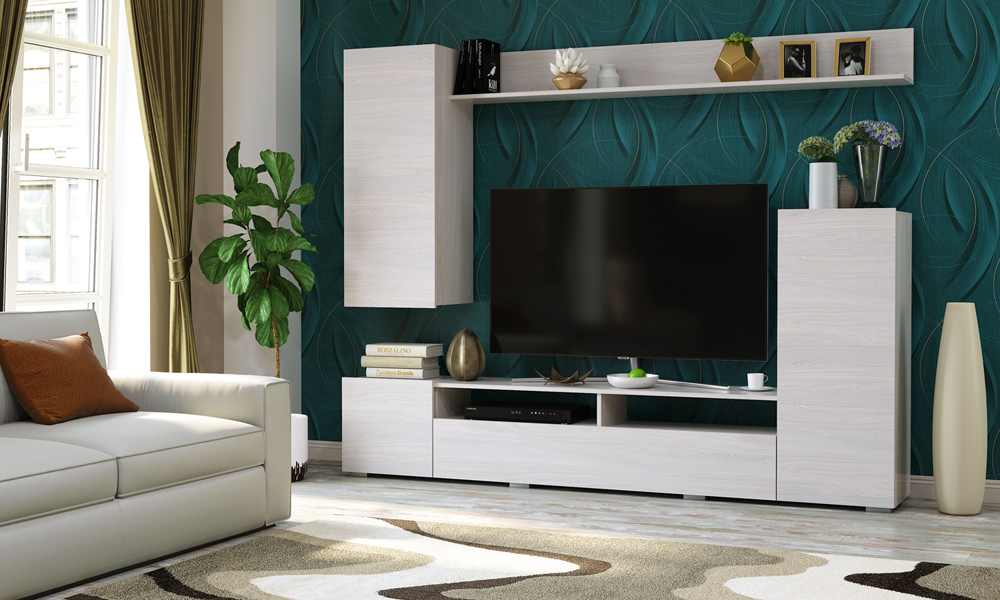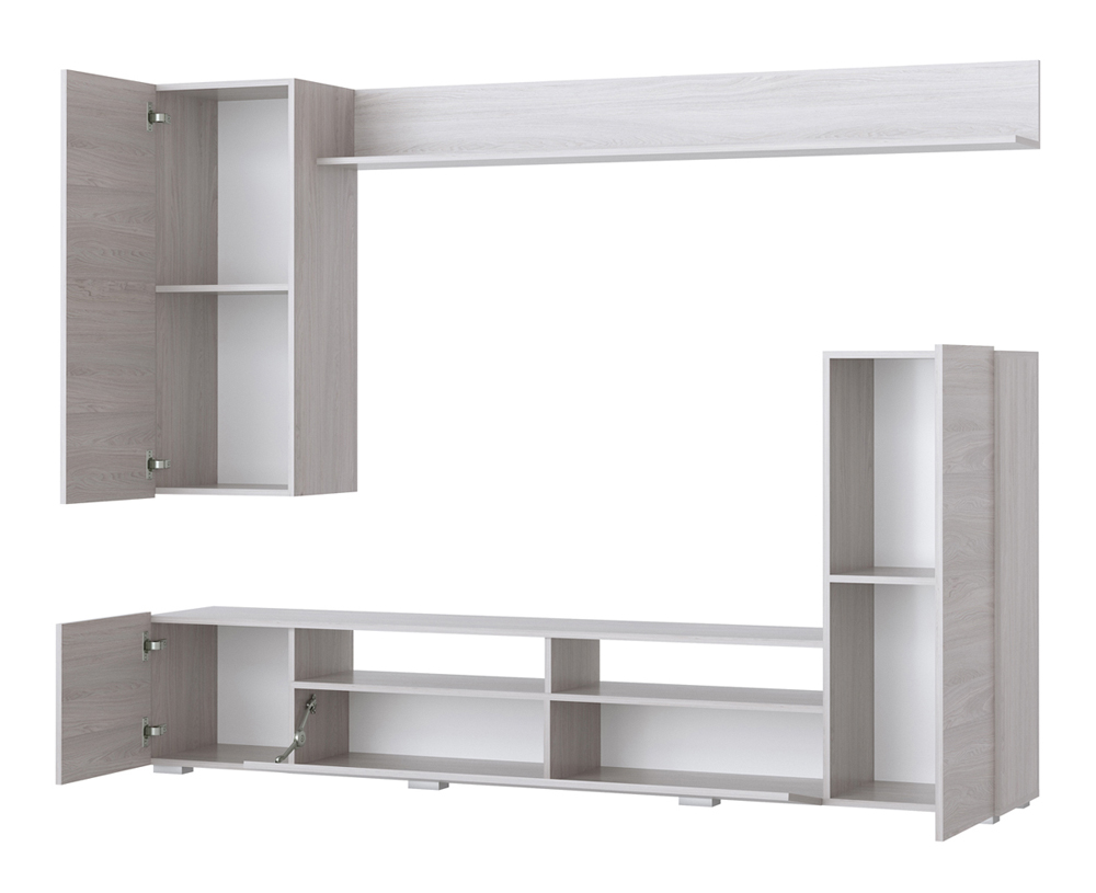 Гостиная «Мия» состоит из 2-х секций. Напольная тумба с пеналом и навесная антресоль с полкой. Антресоль крепится к стене через навесные элементы.