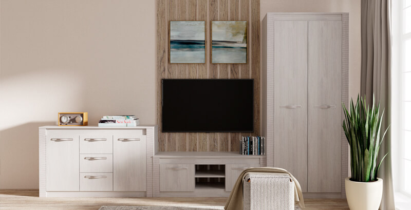 Коллекция №1 состоит из удобной тумбы под ТВ, двухстворчатого распашного шкафа и вместительного комода.