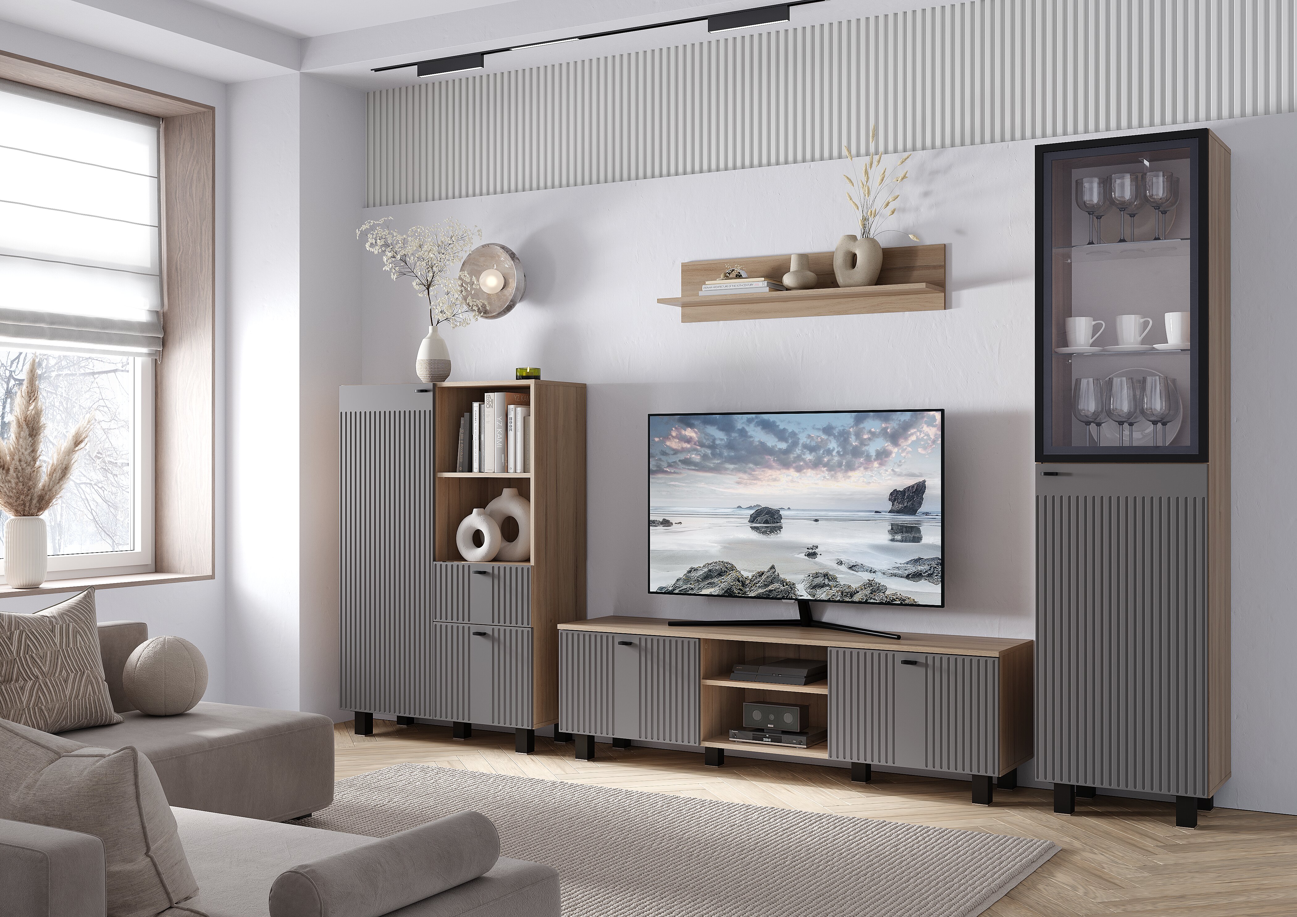 Гостиная «Олива» - это идеальное сочетание современного дизайна и функционала. Матовые фасады пастельного оттенка с оригинальной фрезеровкой будут отлично гармонировать как с насыщенными и нестандартными, так и с классическими решениями в интерьере .