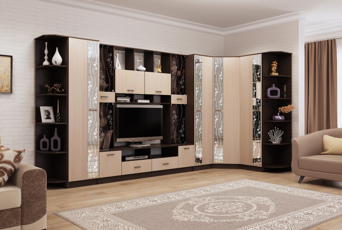 Варианты цветового решения гостиной «САБИНА»: «Дуб Венге» - «Дуб Белфорт», «Ясень Анкор светлый».