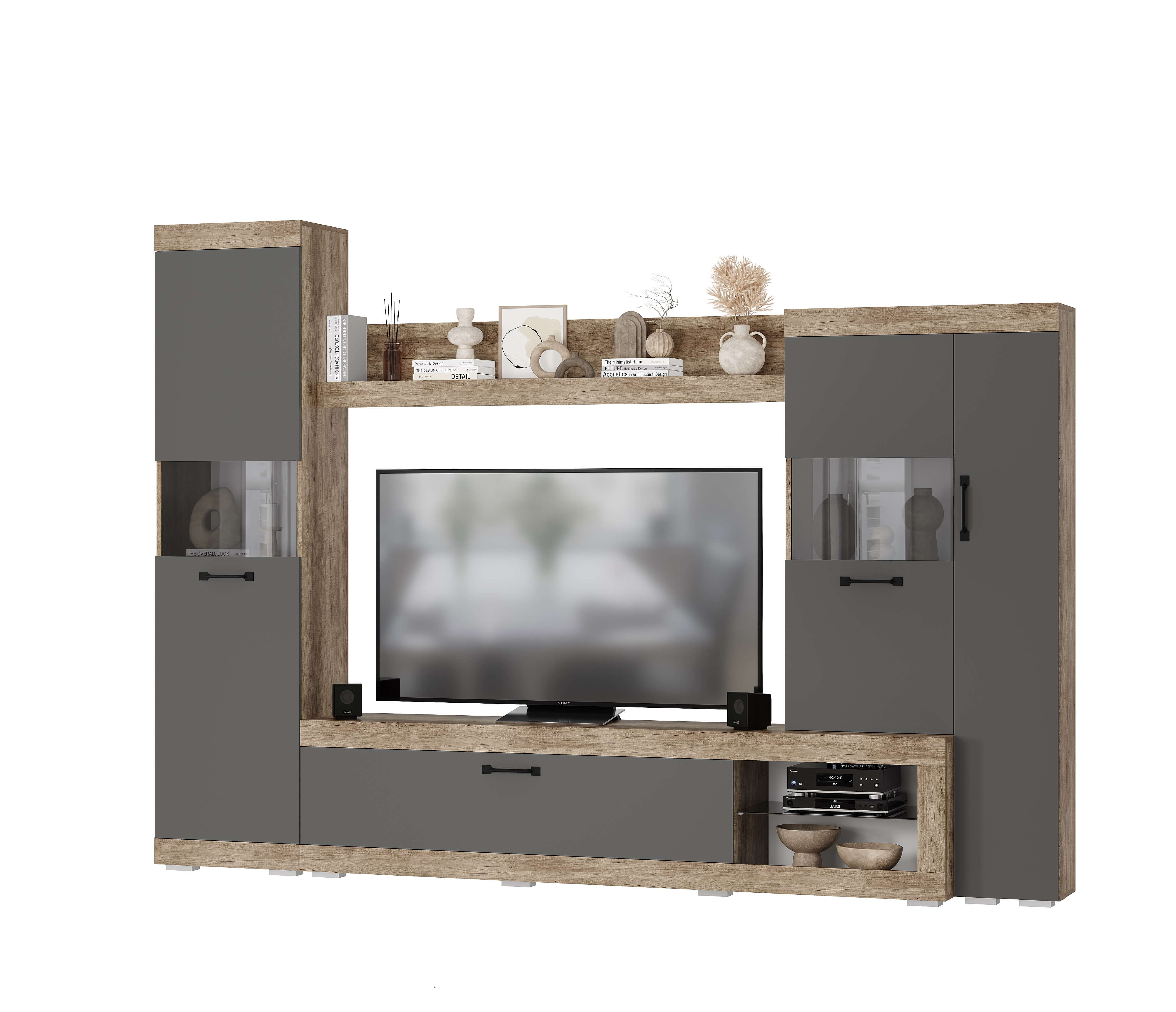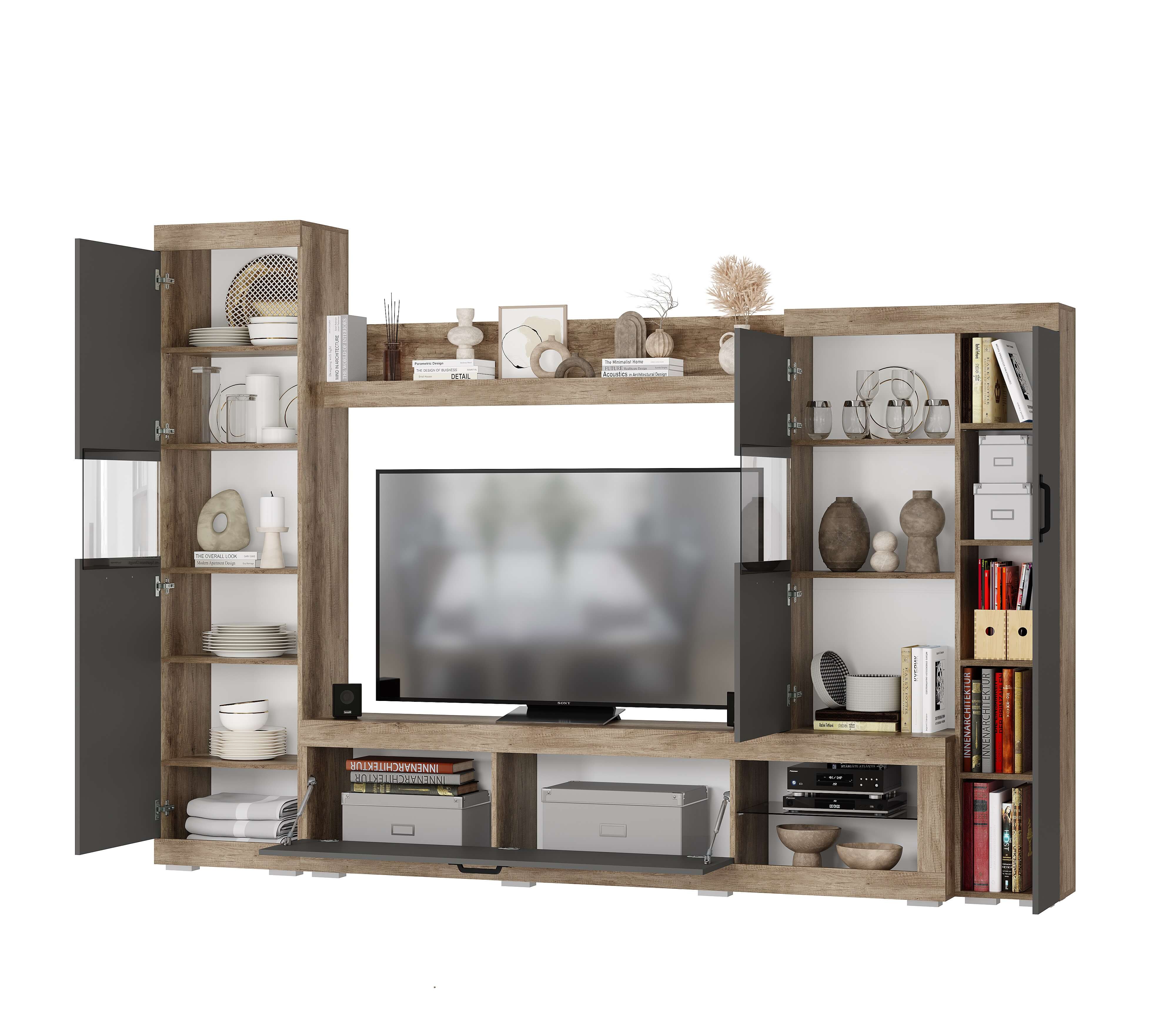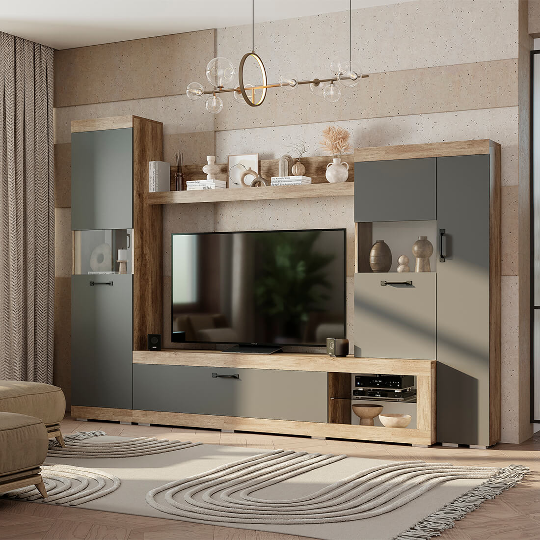 Современная гостиная «Тесла» – это надёжность, практичность и функциональность в интерьере дома, которые подчеркнут Ваше стремление ко всему новому и эксклюзивному. Корпус из ЛДСП цвета «дуб каньон» с эффектом натурального спила элитного сорта дуба, имеющего пористую текстуру с выделенной структурой древесных волокон идеально сочетается с однотонными фасадами насыщенного грифельного оттенка.