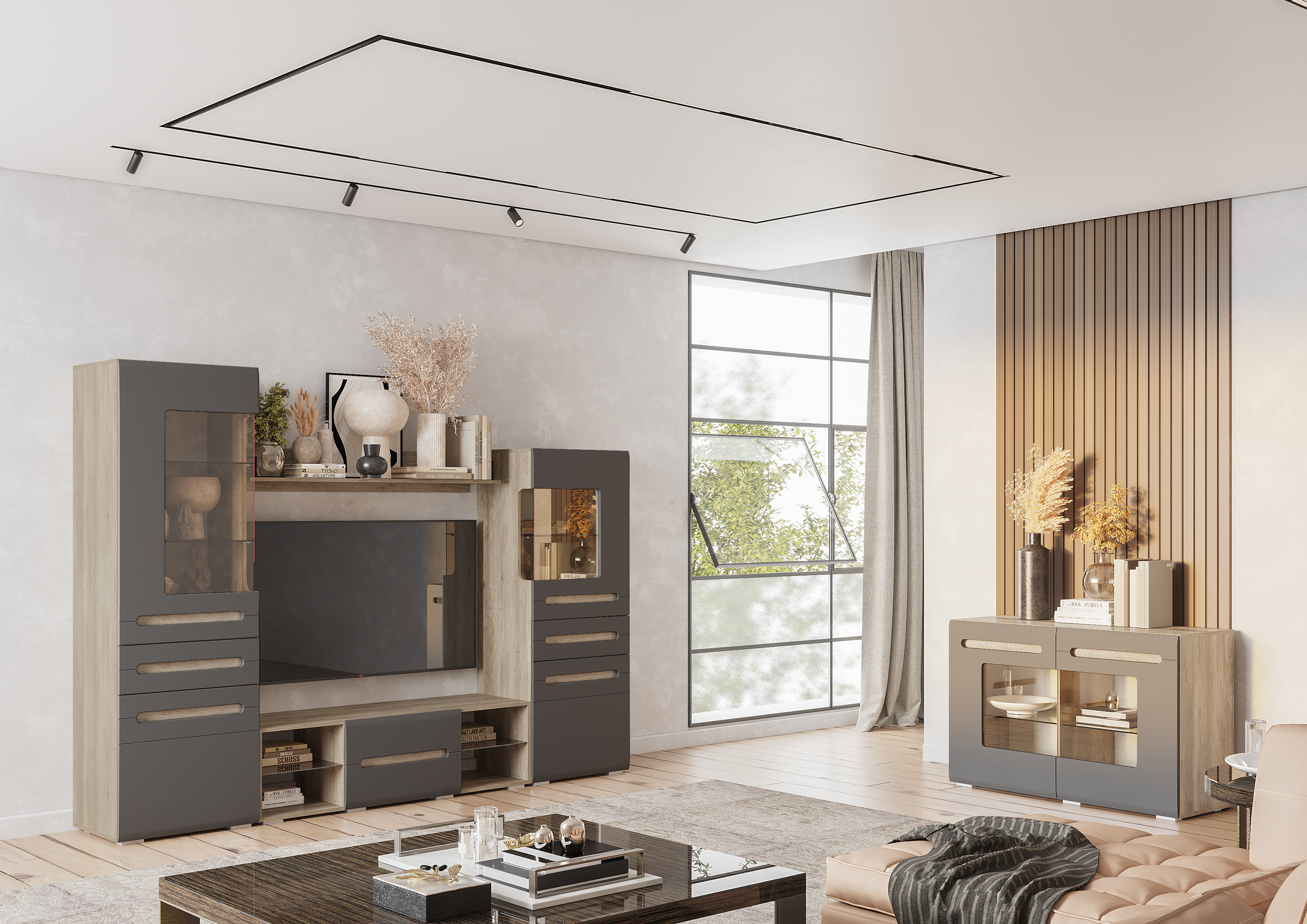 Модульная коллекция «Наоми» в декоре F24 – это стильное современное решение в контрастном сочетании корпуса «дуб каньон» с элегантным матовым фасадом насыщенного грифельного оттенка. Подобное сочетание цветов даёт полное основание коллекции стать хитом интерьера вашей квартиры.