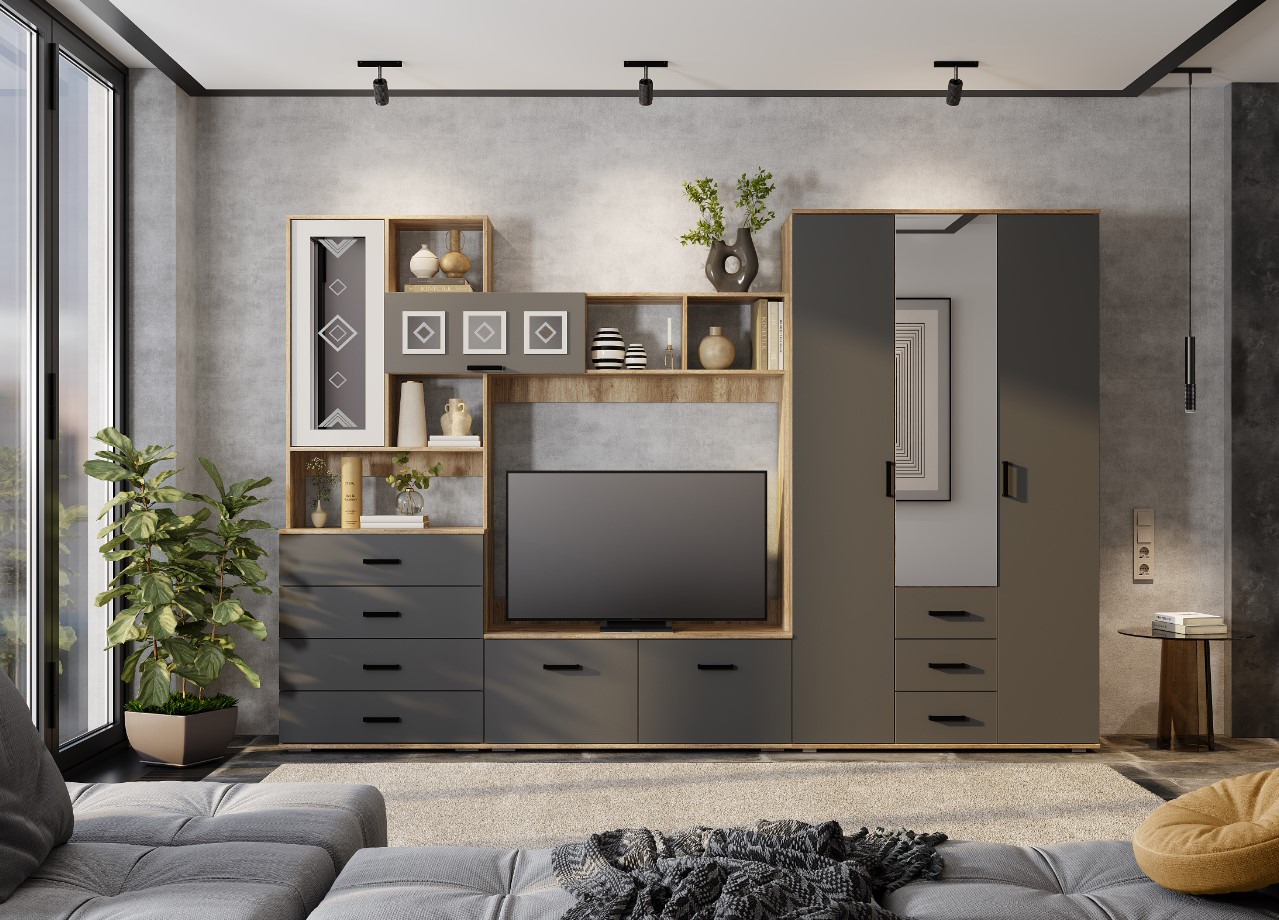 Модульная гостиная «Вегас» выполнена в современном стиле. Функциональная и лаконичная мебель, контрастные тона, стилизованный декор, сочетающий в себе простые геометрические формы, придают любому помещению уют и тепло, не требуя при этом дополнительного оформления жилого пространства. Особый шарм этой модели придает отделка бронзовыми зеркалами с фьюзингом, пескоструйной обработкой и еврокромкой. Вместительные полки для белья, встроенный компактный комод, открытые полки для различных мелочей максимально позволят сэкономить пространство.