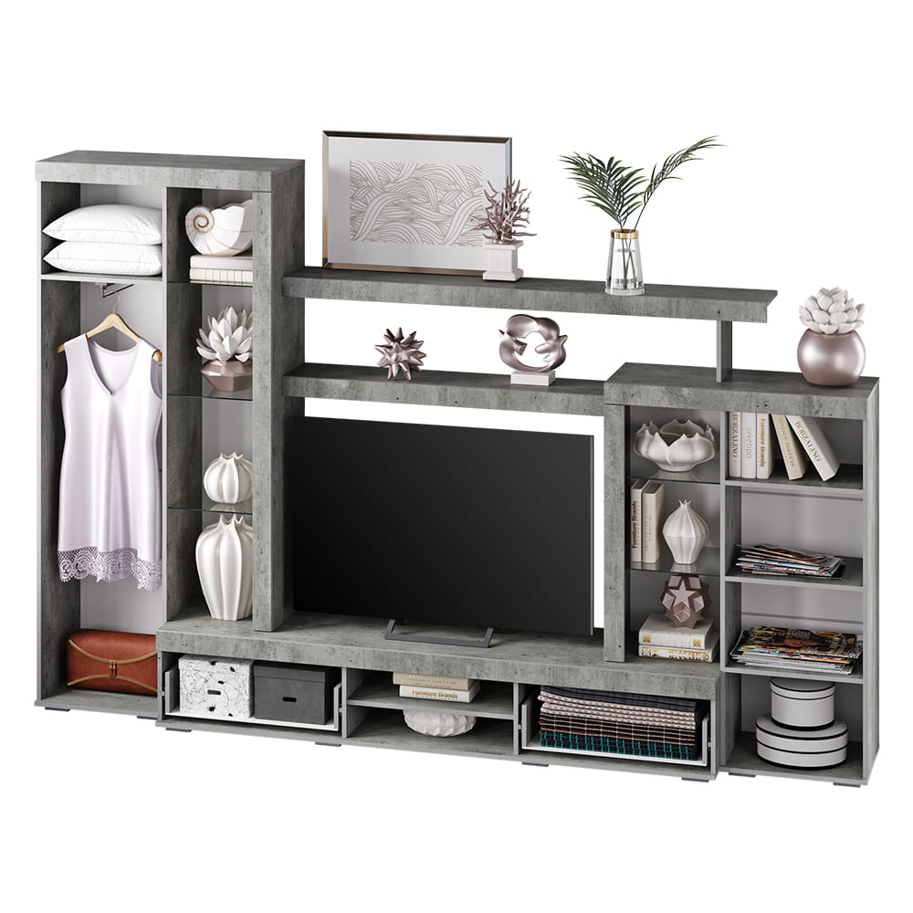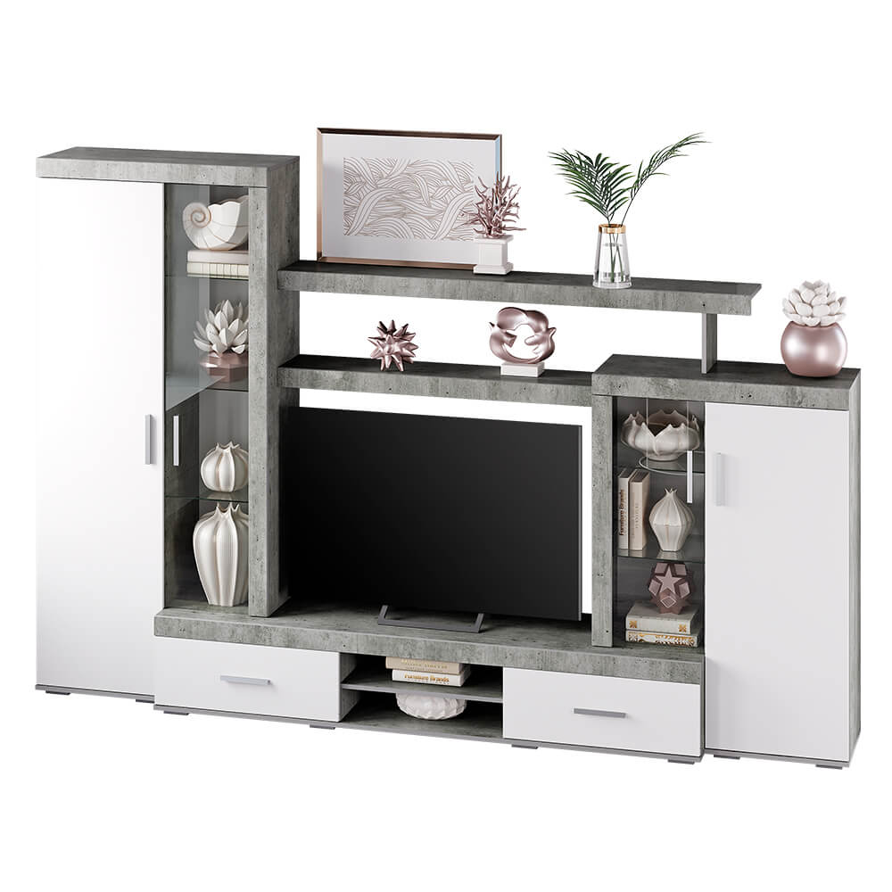 цвет бетон корпуса в комбинации с белыми фасадами и вставками из стекла придают гостиной Интсайл легкости,