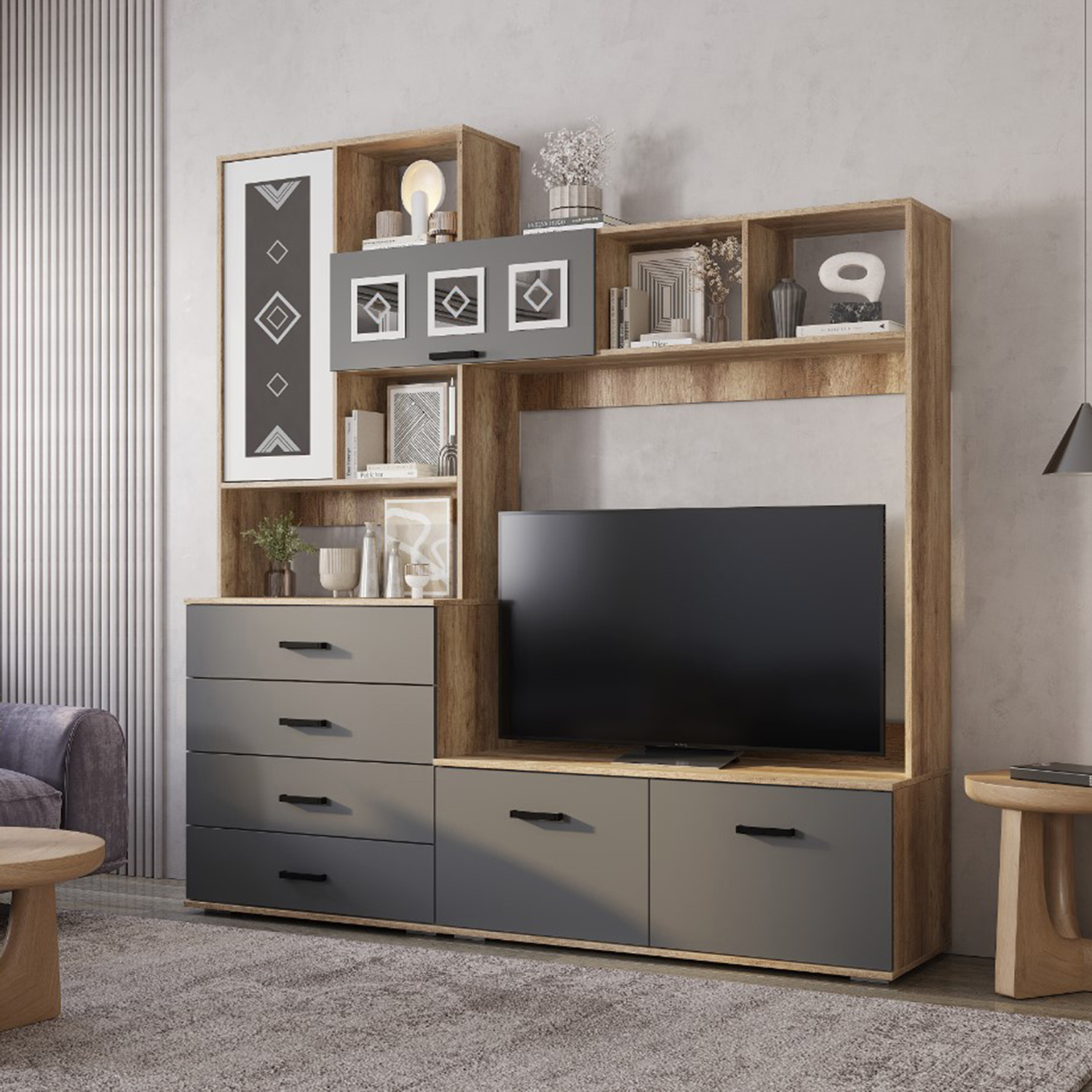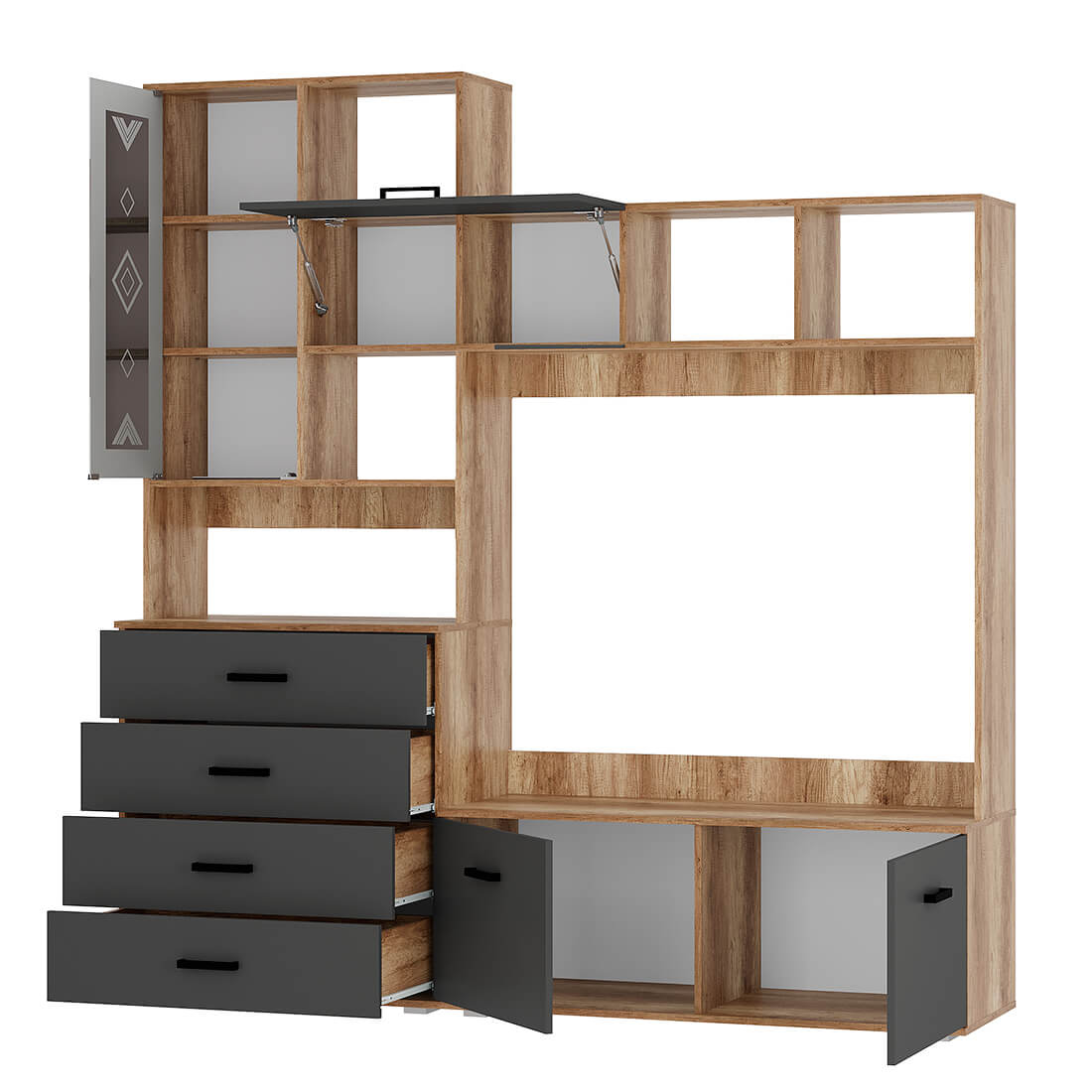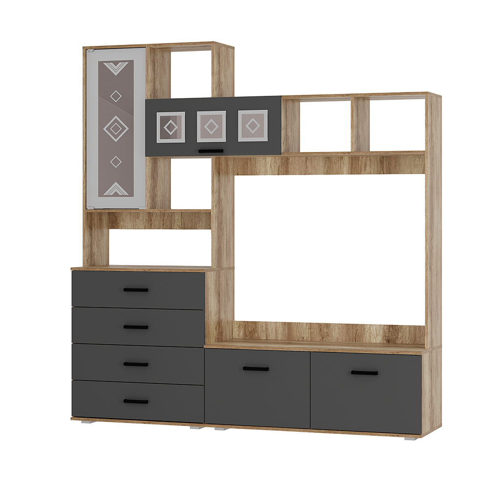 Центральная секция «Вегас» ЦС-03 - это разноуровневая многофункциональная система для главной комнаты в доме. Вместительные полки, встроенный компактный комод, открытые полки для различных мелочей позволят максимально эффективно использовать пространство.