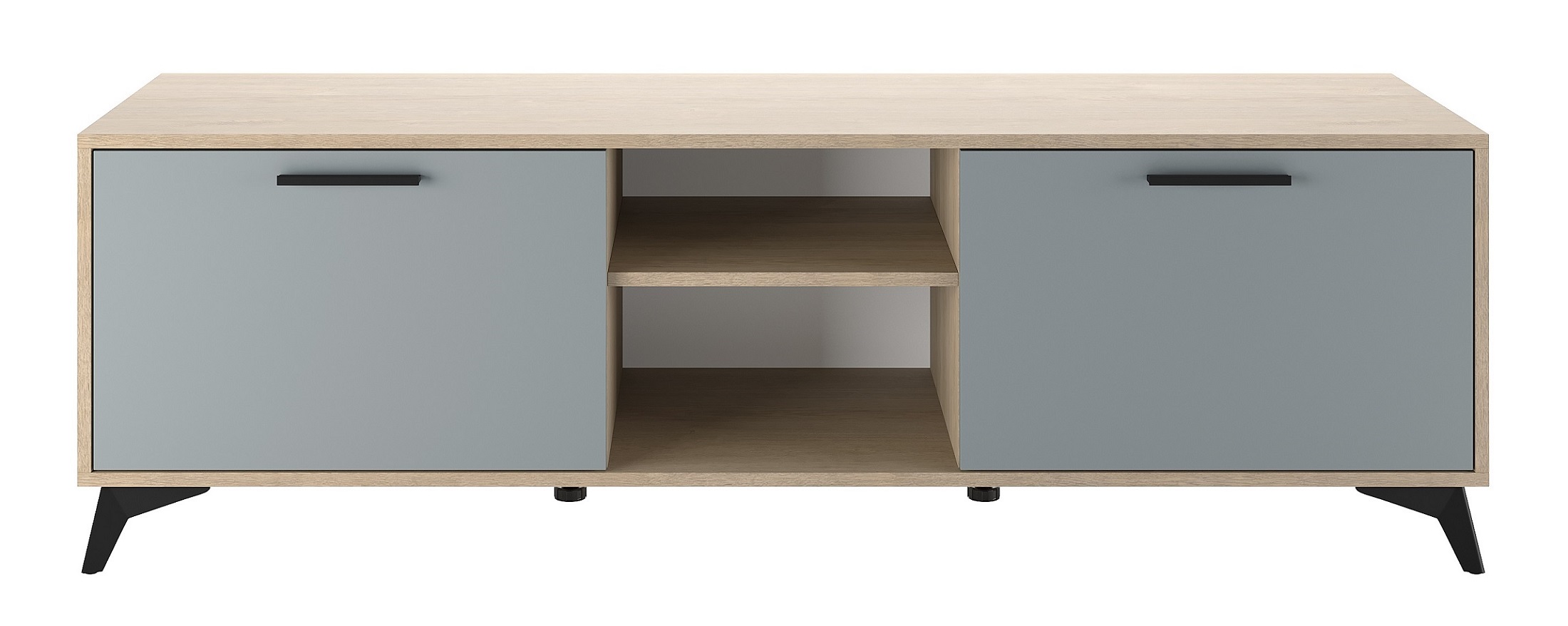 Тумба 1600 2С «ЕВА» с откидными створками на газлифтах. Фасады, крышка и лицевой периметр тумбы обработаны кромкой 1 мм. Чёрные металлические ручки и ножки-опоры.