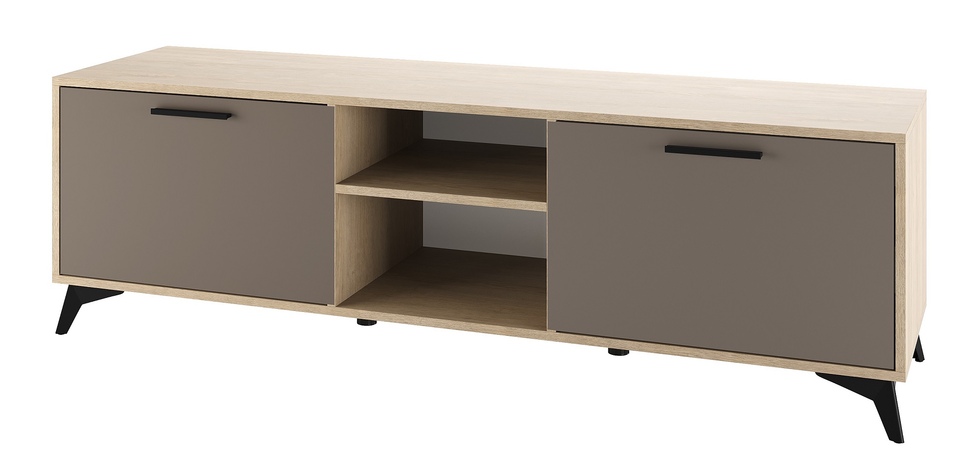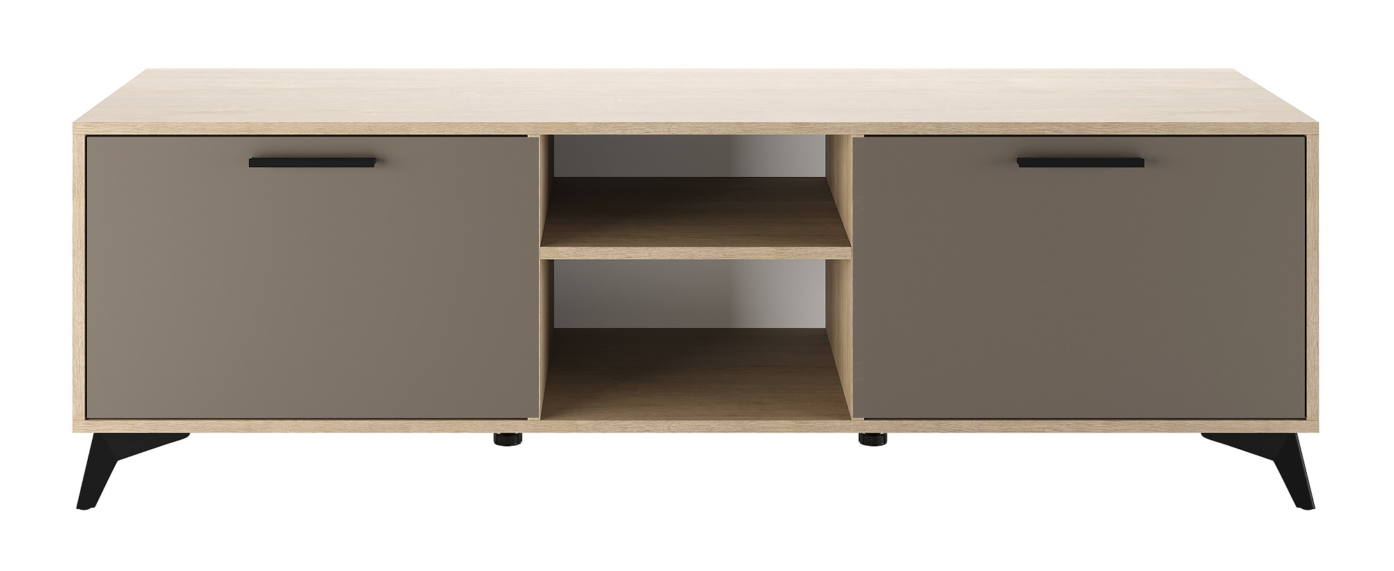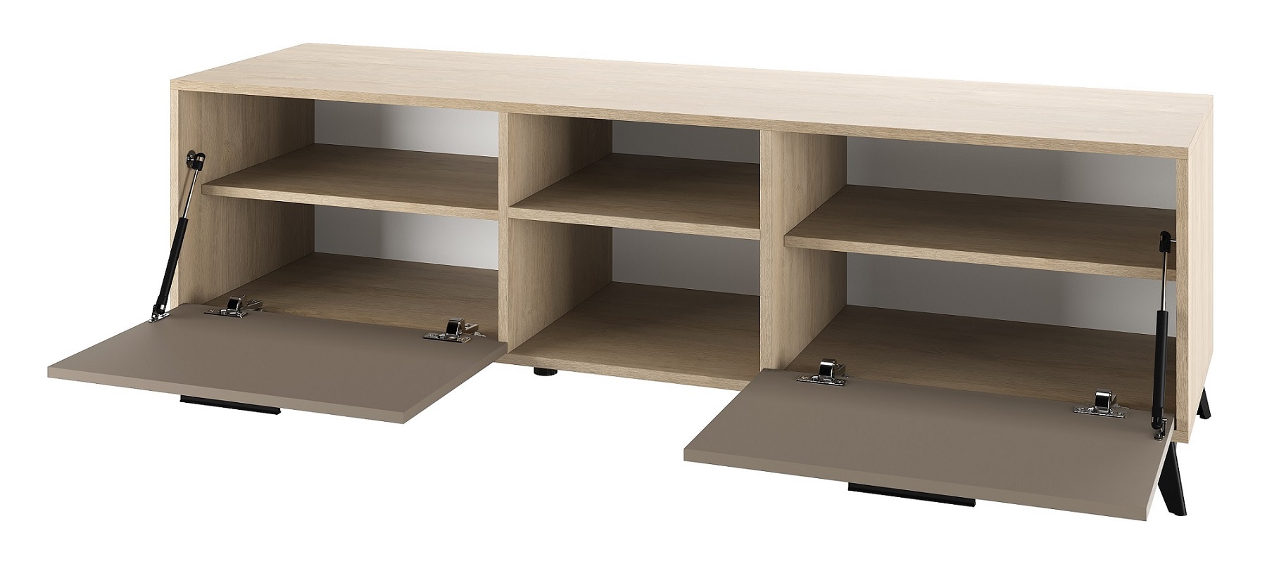 Тумба 1600 2С «ЕВА» с откидными створками на газлифтах. Фасады, крышка и лицевой периметр тумбы обработаны кромкой 1 мм. Чёрные металлические ручки и ножки-опоры.