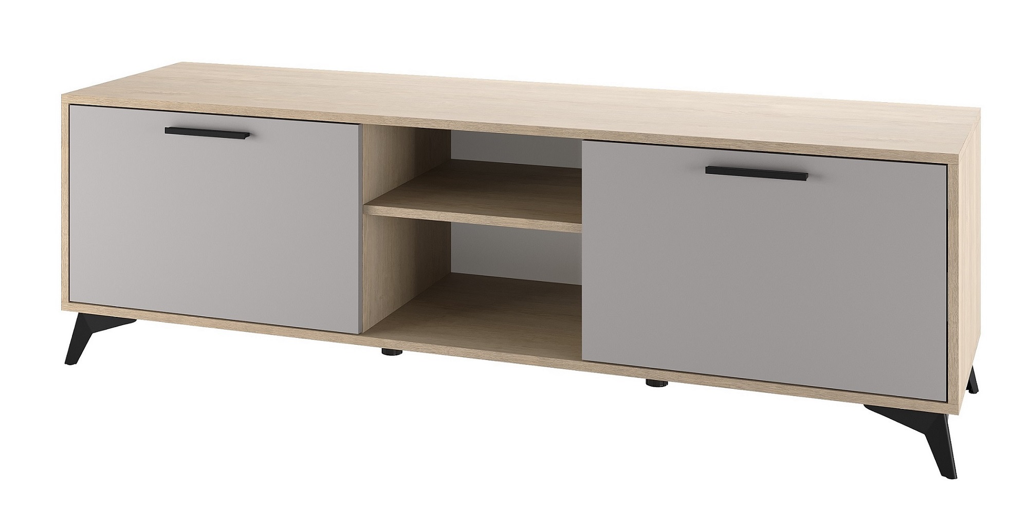 Тумба 1600 2С «ЕВА» с откидными створками на газлифтах. Фасады, крышка и лицевой периметр тумбы обработаны кромкой 1 мм. Чёрные металлические ручки и ножки-опоры.