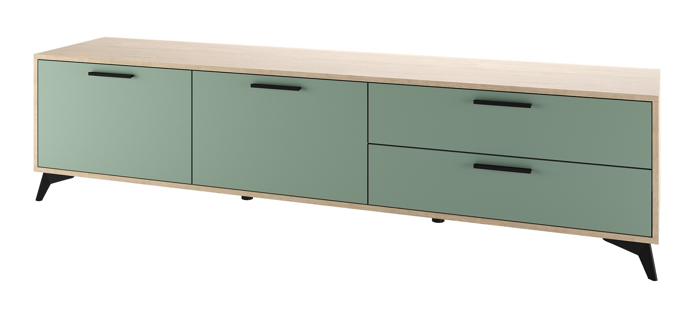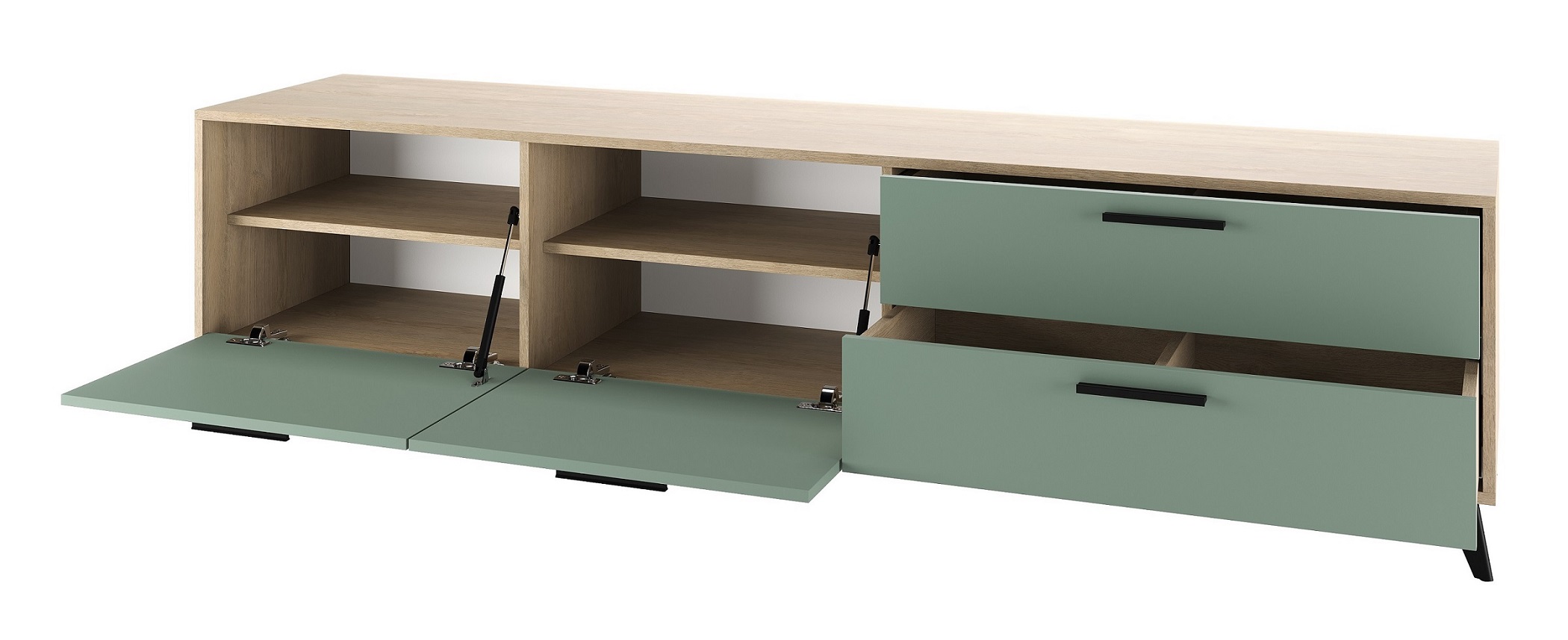 Тумба 2000 2С2Я «ЕВА» с откидными створками на газлифтах и ящиками на направляющих скрытого монтажа с доводчиками. Фасады, крышка и лицевой периметр тумбы обработаны кромкой 1 мм. Чёрные металлические ручки и ножки-опоры