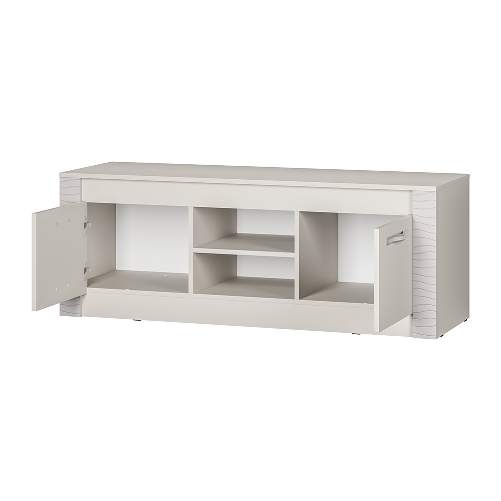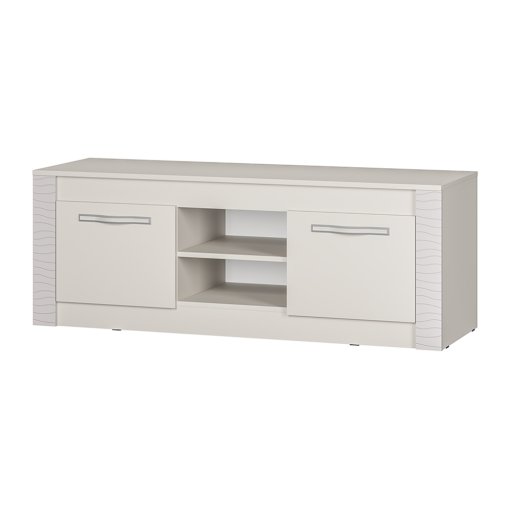 Стильная и лаконичная тумба под ТВ «Монако» станет украшением вашей гостиной. Модель выполнена в едином стиле с другими модулями мебельной коллекции Монако. Она изготовлена из высококачественной ЛДСП цвета «кашемир» и имеет декоративную отделку фасадов из МДФ. Изделие состоит из двух центральных открытых ниш, а также полок, спрятанных за распашными дверцами. На столешнице вы сможете разместить телевизор, а в зонах хранения – необходимые вещи и технику.