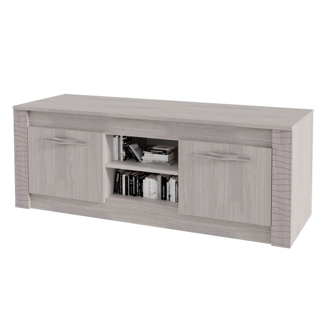 она изготовлена из высококачественной ЛДСП цвета белого ясеня и имеет декоративную отделку фасадов из МДФ. Изделие состоит из двух центральных открытых ниш, а также полок, спрятанных за распашными дверцами. На столешнице вы сможете разместить телевизор, а в зонах хранения – необходимые вещи и технику.
