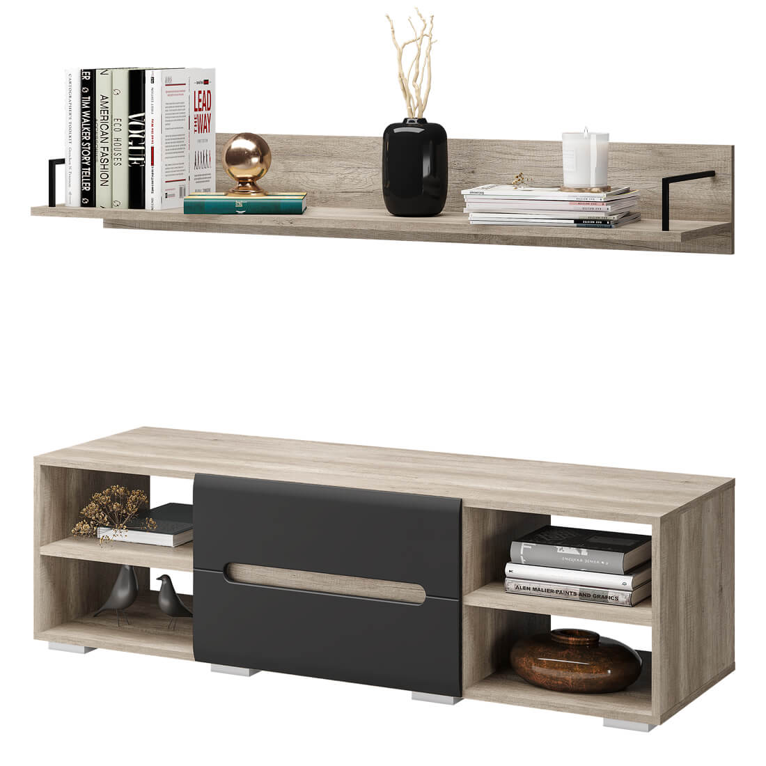 Стильная и очень вместительная комбинация из тумбы под ТВ и полки Наоми является частью одноимённой модульной серии.