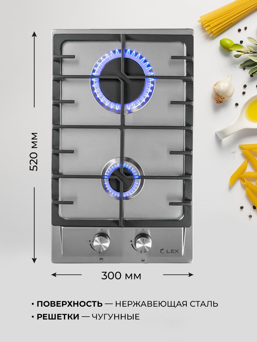 Газовая LEX GVS 321 IX с шириной 300 мм изготовлена из нержавеющей стали, снабжена решетками с чугунным напылением. Модель имеет механическое управление, 2 конфорки, одна из которых повышенной мощности. LEX GVS 321 IX также имеет электроподжиг и газ-контроль, прекращающий подачу газа, когда пламя случайно гаснет. Подходит для магистрального и баллонного газа.