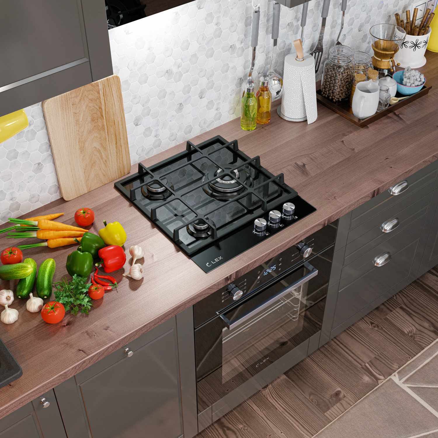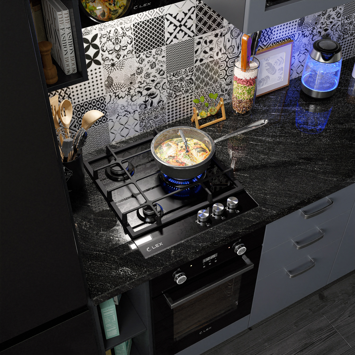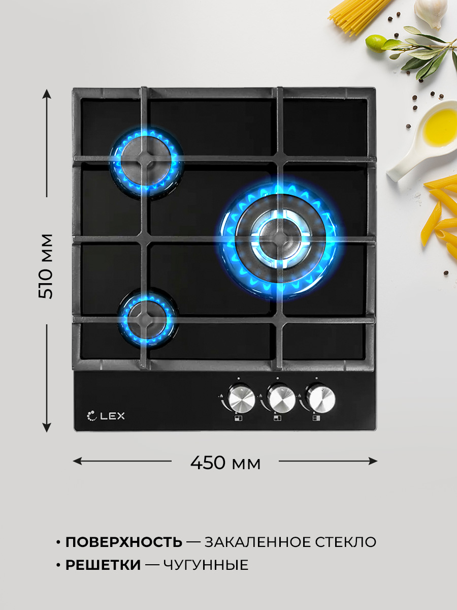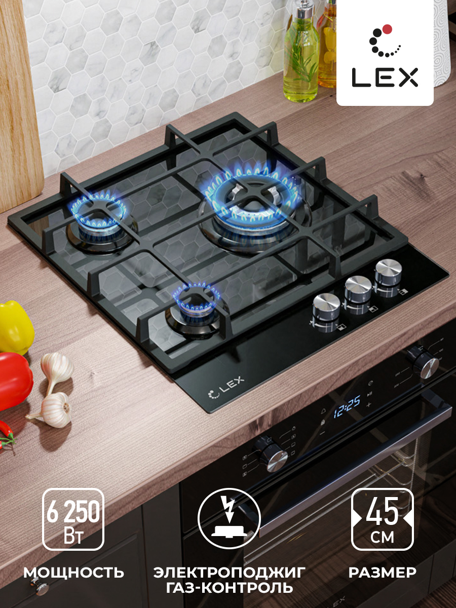 Модель LEX GVG 431 BL это газовая варочная поверхность с 3 конфорками различного диаметра и мощности, чугунными решетками, и рабочей поверхностью из прочного закаленного стекла. Поверхность из ударопрочного, закаленного стекла это не только стильно, но и практично. Закаленное стекло не впитывает загрязнения, его легко мыть и с годами ваша поверхность не потеряет свою привлекательность. Надежные чугунные решетки не позволят вашей посуде скользить по своей поверхности за счет шероховатой структуры и прослужат вам долгие годы (чугунные решетки не подвержены деформации при воздействии высоких температур, в отличии от стальных решеток). 3 конфорки различной мощности позволят вам использовать для приготовления посуду различного диаметра, а форма решетки подходит даже для приготовления кофе в турке. Поверхность так же оснащена WOK- горелкой. Это горелка увеличенного размера и мощности, снабженная двумя рядами пламени, для более быстрого, мощного и равномерно распределения температуры, что в свою очередь подходит для приготовления разнообразных блюд в том числе и национальных блюд разных стран. За счет равномерного распределения температуры данная конфорка идеально подойдет для томления. Электроподжиг интегрированный в каждую ручку позволит вам включить подачу газа и поджечь конфорку движением одной руки. Каждая конфорка снабжена системой газ контроля, что делает данную поверхность не только стильной и практичной, но еще и максимально безопасной. При затухании огня, система газ контроля автоматически прекратит подачу газа.