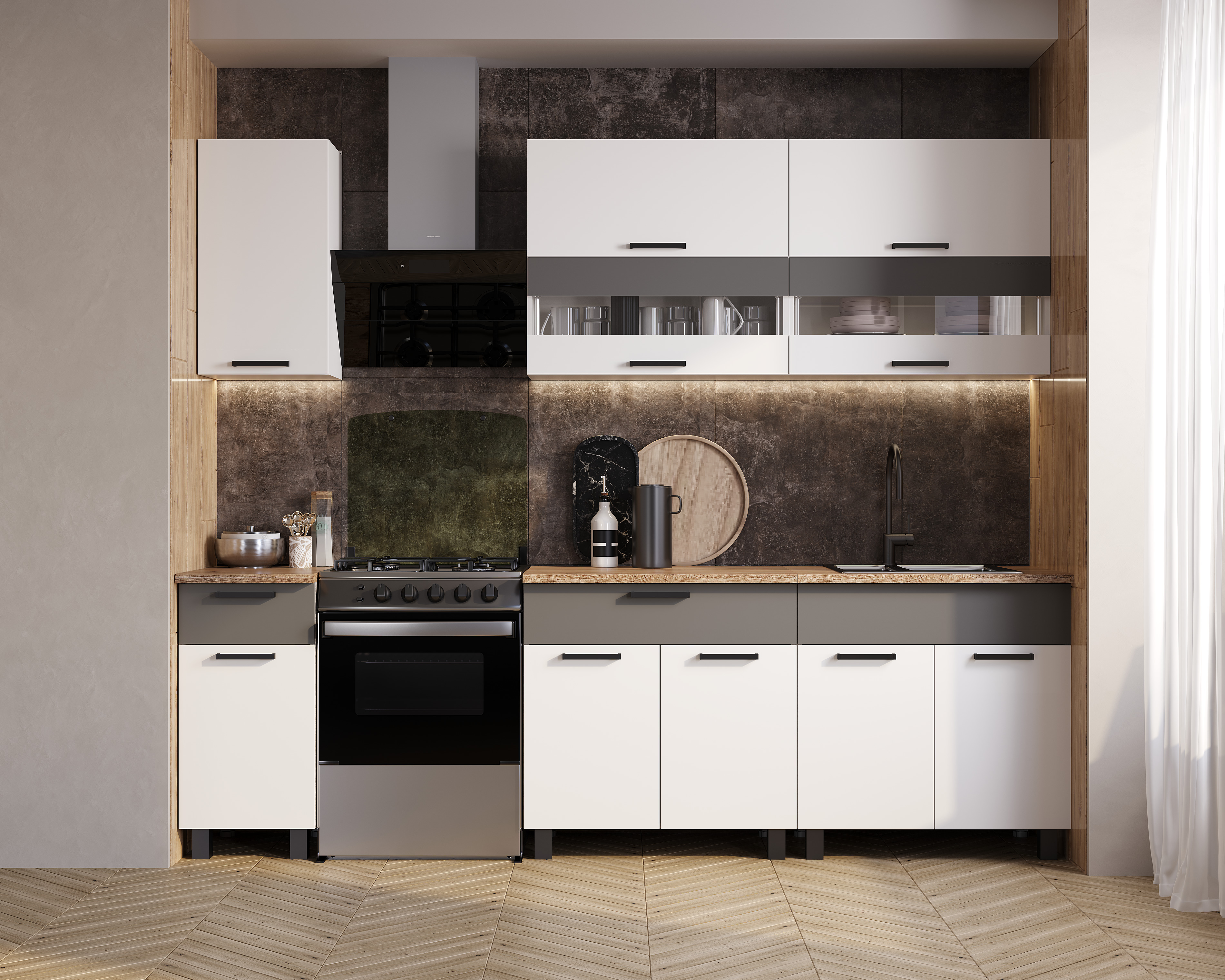 В комплекте раздельная столешница (800/800/400мм) толщиной 38 мм Дуб кера.