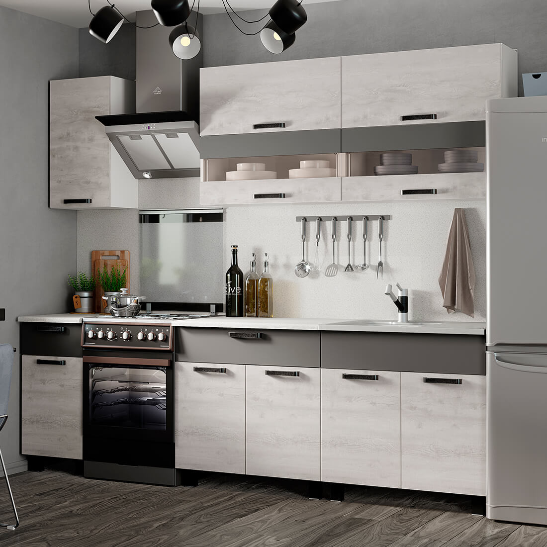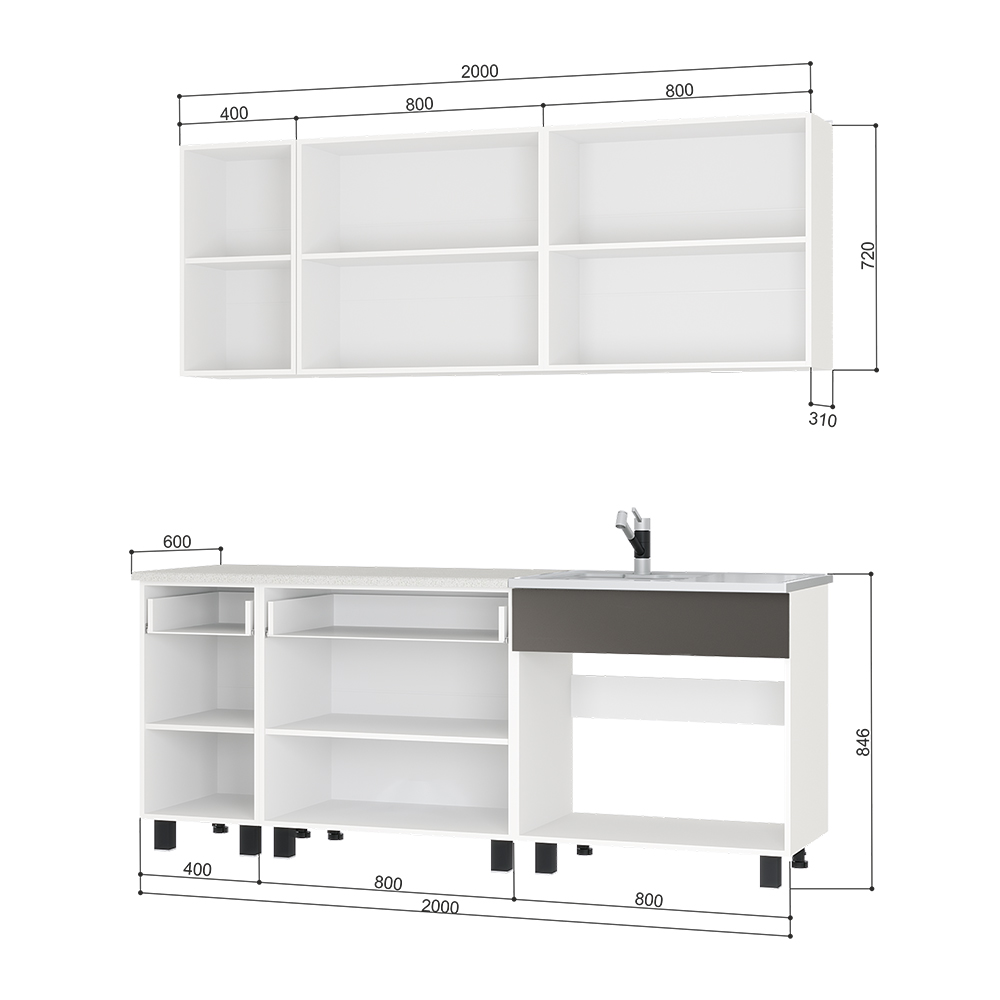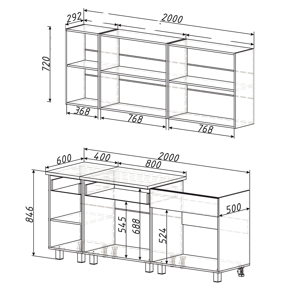 Габаритные размеры композиции нижних модулей с учётом столешницы: ширина: 2000 мм; высота: 846 мм; глубина: 600 мм.