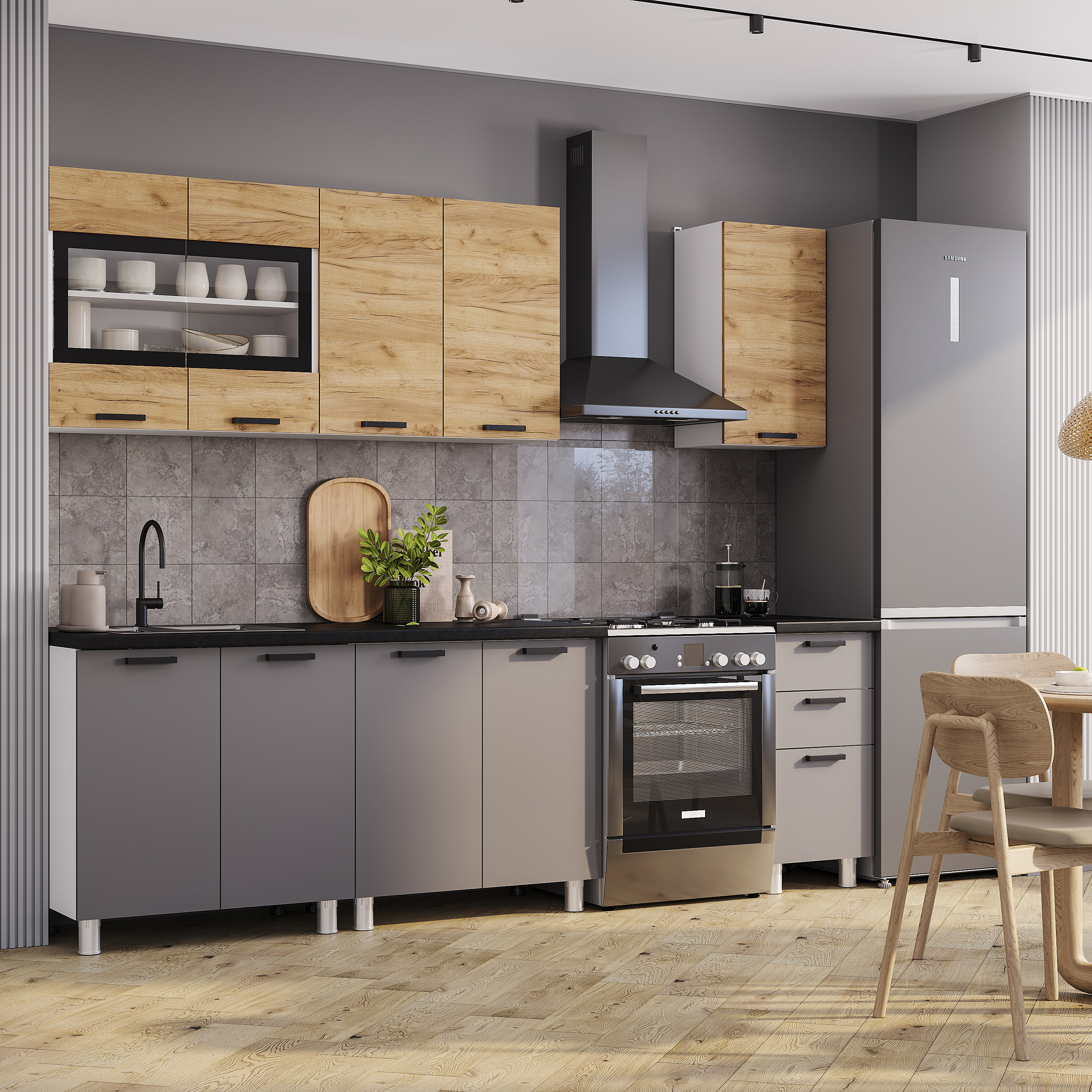 .Кухня «Крафт», выполненная в стиле «лофт», - это воплощение самых актуальных трендов в дизайне мебели. Глубокий и насыщенный «графит» для нижней секции и «крафт» для верхней идеально дополняют друг друга, создавая элегантный и сдержанный образ кухни.