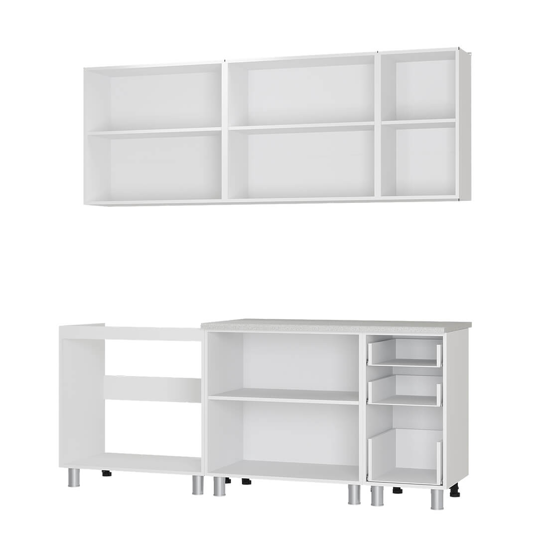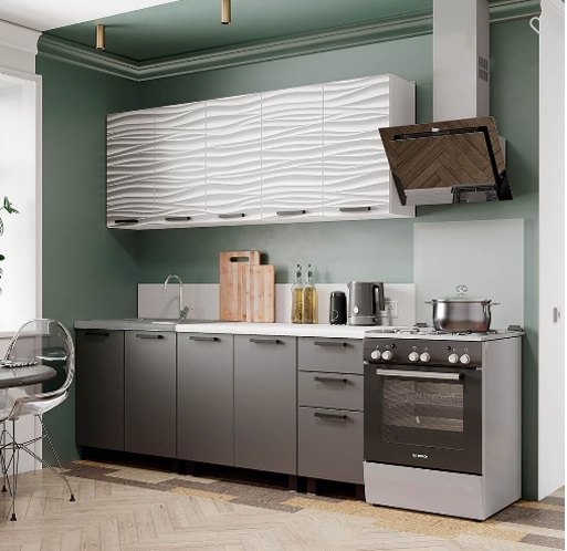 Габаритные размеры композиции нижних модулей с учётом столешницы: ширина: 2000 мм, высота: 846 мм, глубина: 600 мм. Габаритные размеры композиции верхних модулей: ширина: 2000 мм, высота: 720 мм, глубина: 304 мм.