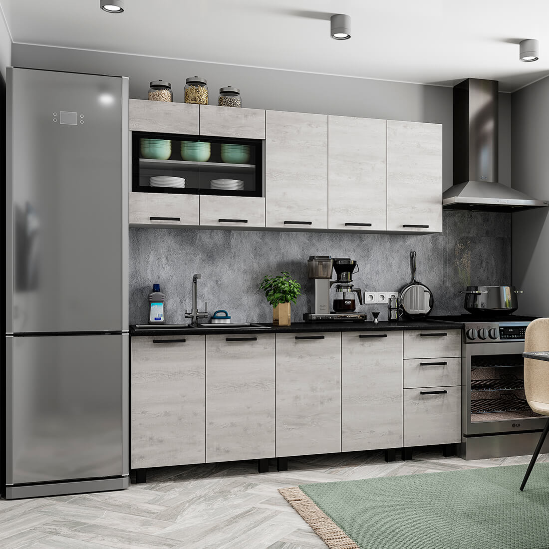 Стильная кухня, выполненная в модном декоре «бетон пайн», удачно вписывается в городской индустриальный стиль и выглядит очень необычно и оригинально. Отличительная черта цвета в сочетании светлой бетонной поверхности, визуально расширяющей пространство, и состаренной древесины. Кухня с лёгкостью впишется в любой эклектичный интерьер.