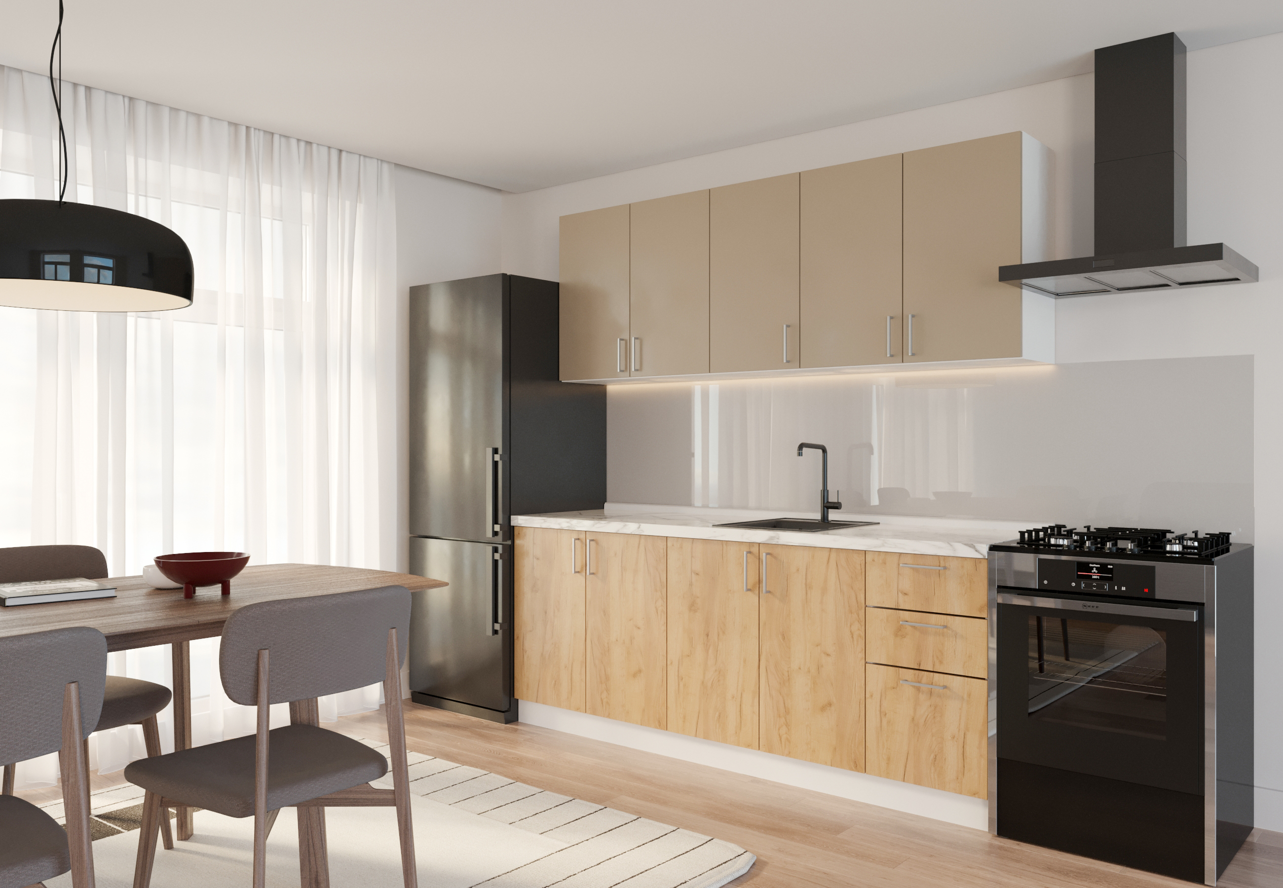Щитовые фасады из ЛДСП: Эти фасады выполнены в благородных древесных тонах, добавляя кухне теплоты и уюта. Форма и исполнение: Все фасады имеют прямую форму без фрезеровки, что подчеркивает минималистичный и современный стиль кухни. Стекла в фасадах отсутствуют, что придает гарнитуру цельный и лаконичный вид.
