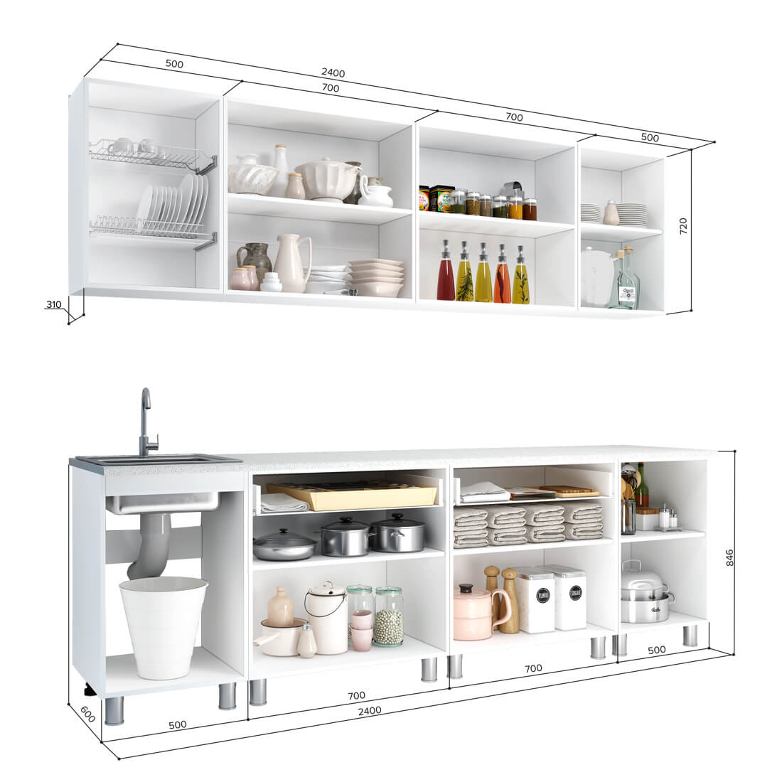 Габаритные размеры композиции нижних модулей с учётом столешницы: Ширина: 2400 мм. Высота: 846 мм. Глубина: 595 мм. Габаритные размеры композиции верхних модулей: Ширина: 2400 мм. Высота: 720 мм. Глубина: 304 мм.