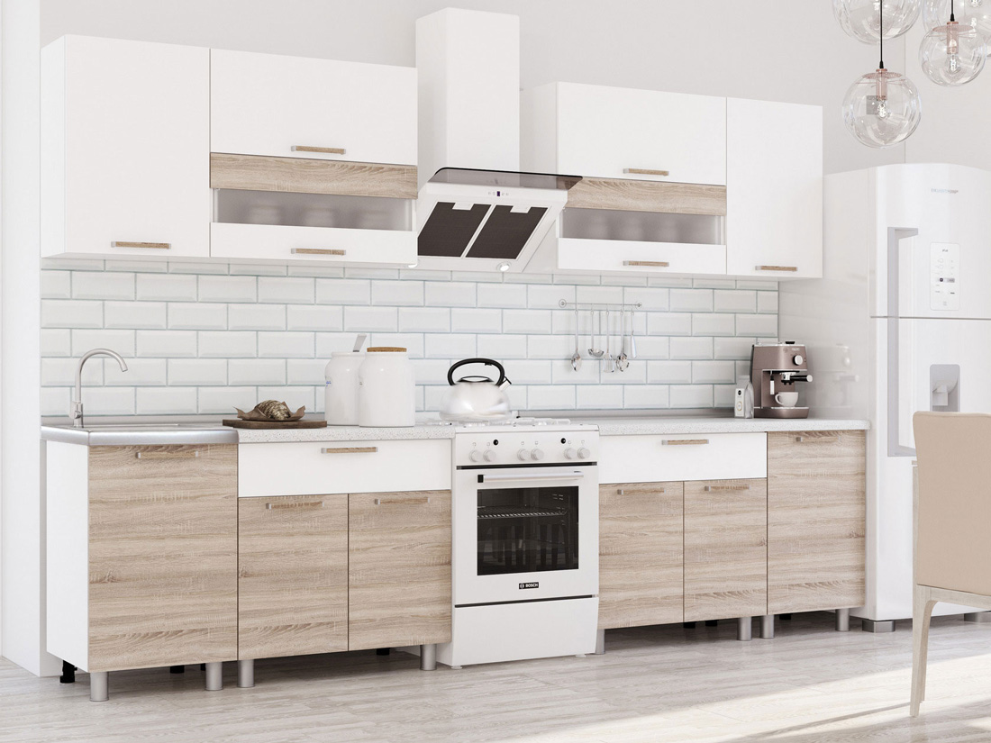 Стильная современная кухня «Айсбери» 2,4 м пропитана атмосферой душевного тепла и солнечного света. Классическое сочетание белого цвета с древесной фактурой - лучшее решение для Вашей кухни!