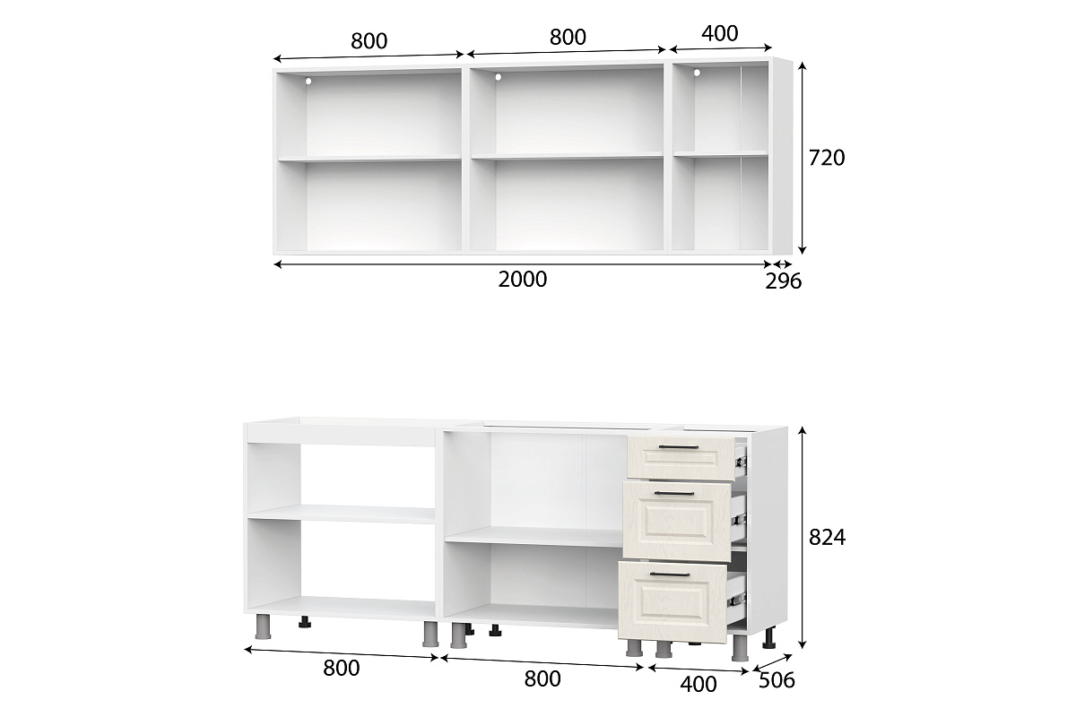 Столешница, стеновая панель, а также дополнительное оборудование (мойка, смеситель, бытовая техника) приобретаются отдельно.