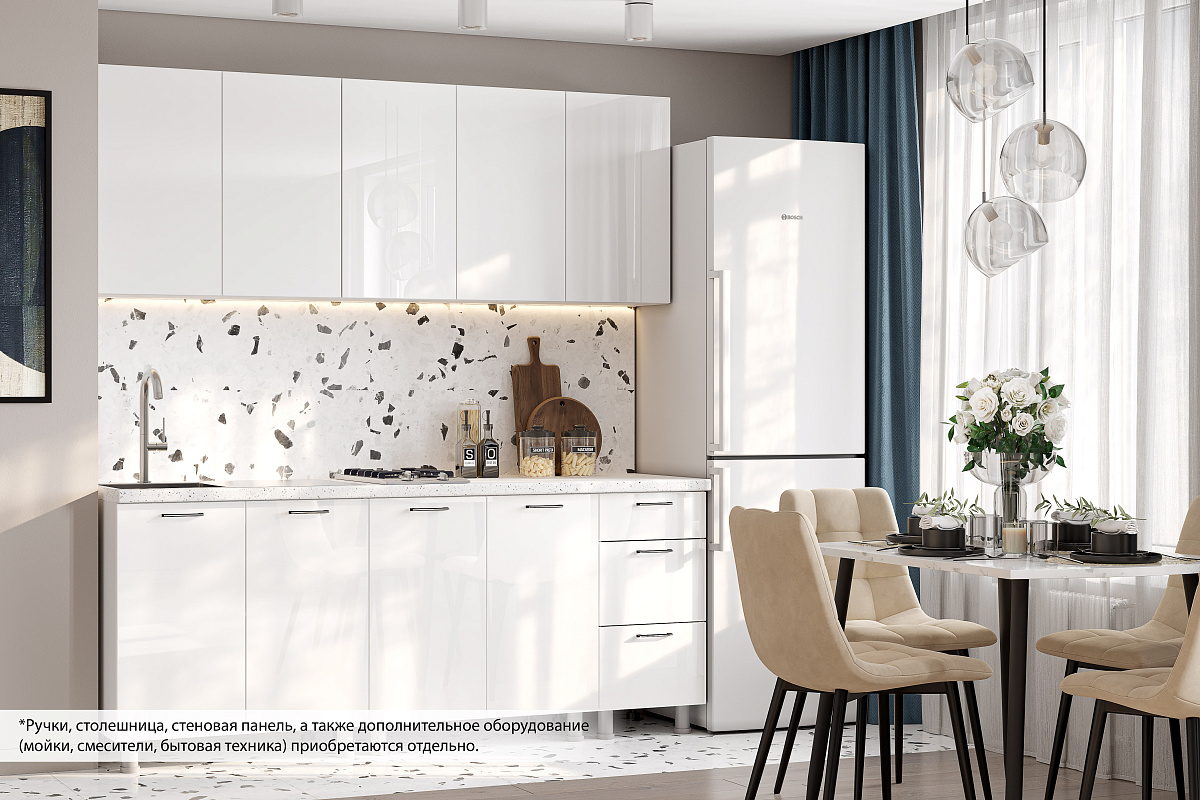 Ручки, толкатели, столешница, стеновая панель, а также дополнительное оборудование (мойка, смеситель, бытовая техника) приобретаются отдельно.