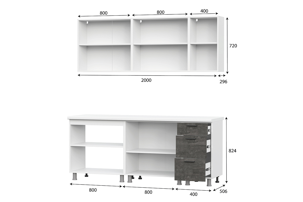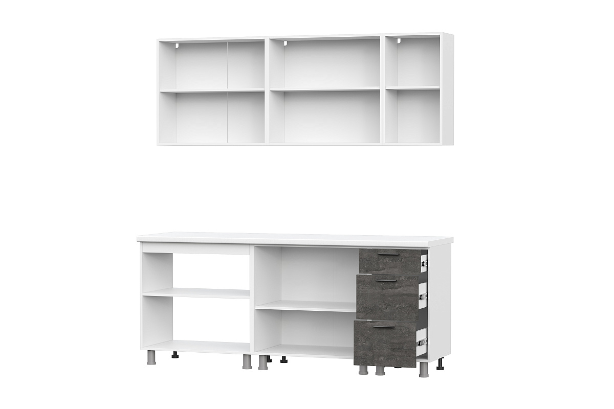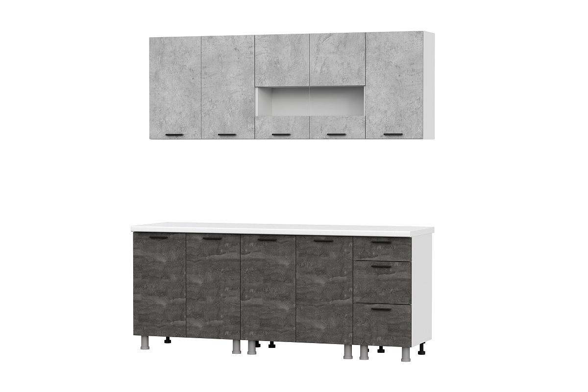 Гарнитур столешницей не комплектуется. Все фасады универсальные. Кухня комплектуется опорами, регулируемыми по высоте. Столешница, стеновая панель, а также дополнительное оборудование (мойка, смеситель, бытовая техника) приобретаются отдельно. Ручки в комплекте.