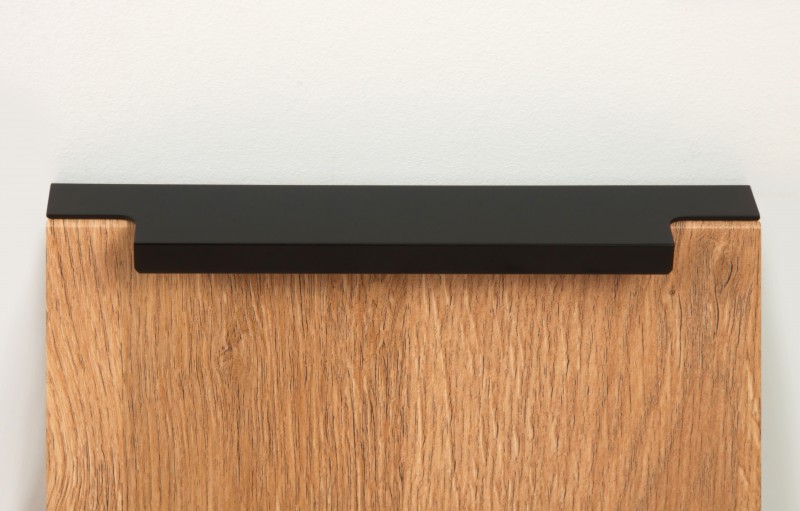 Ручка имеет богатую палитру цветовых решений и разнообразие длин. В зависимости от длины, модель допускает размещение двумя способами — «в размер» фасада и по центру широких фасадов (как большой «язычок»).